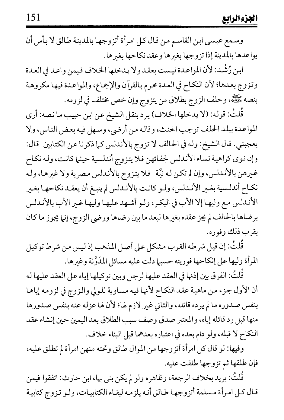 ابن رُشْد: لأن المواعدة ليست بعقد ولا يدخلها الخلاف فييمن واعد في العدة وتزوج بعدها؛ لأن النكاح في العدة محرم بالقرآن والإجماع، والمواعدة فيها مكروهة بنصه صلى الله عليه وسلم، وحلف الزوج بطلاق من يتزوج وإن خص مختلف في لزومه.