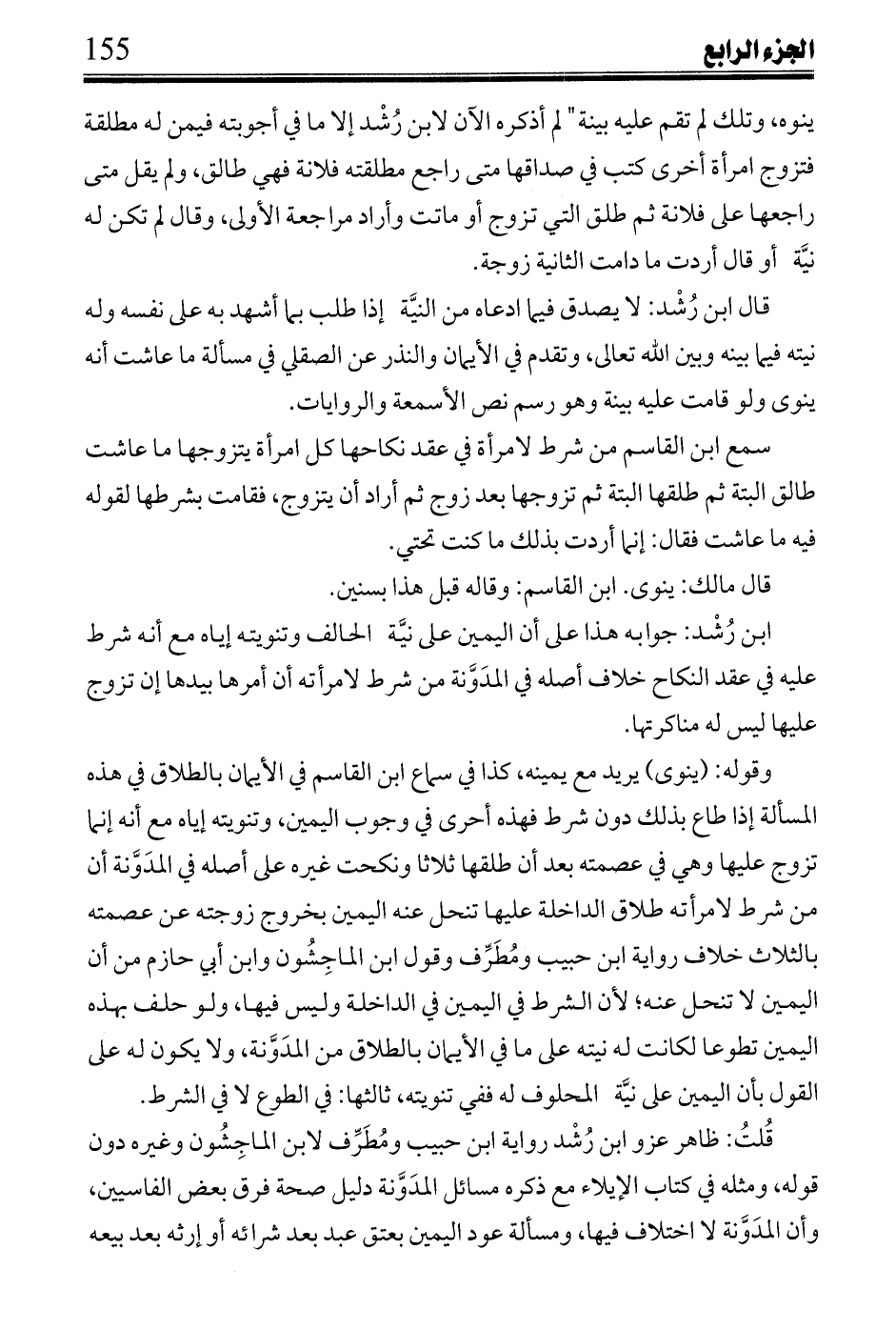 ابن رُشْد: جوابه هذا على أن اليمين على نيَّة الحالف وتنويته إياه مع أنه شرط عليه في عقد النكاح خلاف أصله في المدونَّة من شرط لامرأته أن أمرها بيدها إن تزوج عليها ليس له مناكرتها.