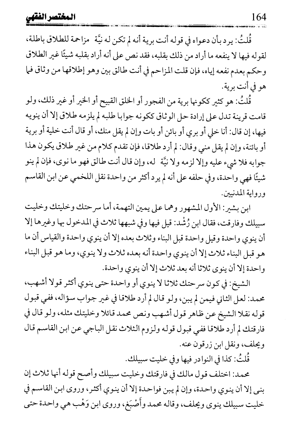 قُلتُ: هو كثير ككونها برية من الفجور أو الخلق القبيح أو الخير أو غير ذلك، ولو قامت قرينة تدل على إرادة حل الوثاق ككونه جوابا طلبه لم يلزمه الطلاق إلا أن ينويه فيها، إن قال: أنا خلي أو بري أو بائن أو بات وإن لم يقل منك، أو قال أنت خلية أو برية أو بائنة، وإن لم يقل مني وقال: لم أرد طلاقا، فإن تقدم كلام من غير طلاق يكون هذا جوابه فلا شيء عليه وإلا لزمه ولا نيَّة له، وإن قال أنت طالق فهو ما نوى، فإن لم ينو شيئاً فهي واحدة، وفي حلفه على أنه لم يرد أكثر من واحدة نقل اللخمي عن ابن القاسم ورواية المدنيين.