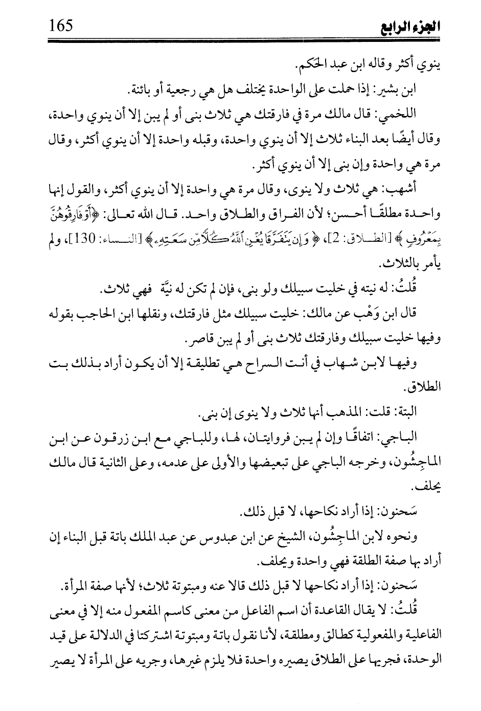 اللخمي: قال مالك مرة في فارقتك هي ثلاث بنى أو لم يبن إلا أن ينوي واحدة، وقال أيضاً بعد البناء ثلاث إلا أن ينوي واحدة، وقبله واحدة إلا أن ينوي أكثر، وقال مرة هي واحدة وإن بنى إلا أن ينوي أكثر.