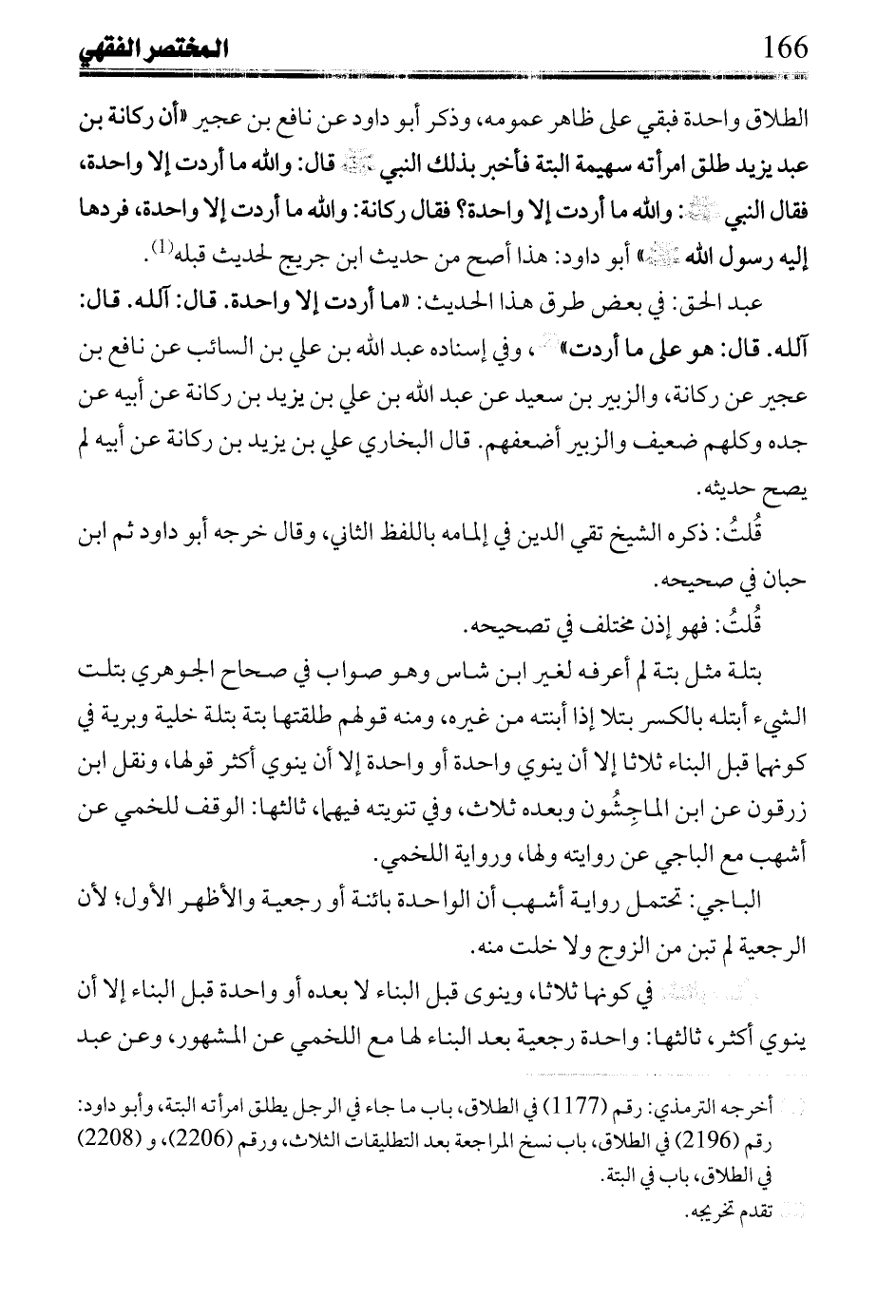 عبد الحق: في بعض طرق هذا الحديث: "ما أردت إلا واحدة. قال آلله. قال آلله. قال: هو على ما أردت"، وفي إسناده عبد الله بن علي بن السائي عن نافع بن عجير عن ركانة، والزبير بن سعيد عن عبد الله بن علي بن يزيد بن ركانة عن أبيه عن جده وكلهم ضعيف والزبير أضعفهم. قال البخاري علي بن يزيد بن ركانة عن أبيه لم يصح حديثه.