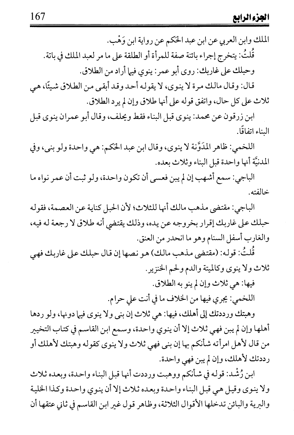 ابن رُشْد: قوله في شأنكم ووَهْبت ورددت أنها قبل البناء واحدة، وبعده ثلاث ولا ينوى وقيل هي قبل البناء واحدة وبعده ثلاث إلا أن ينوي واحدة وكذا الخلية والبرية والبائن تدخلها الأقوال الثلاثة، وظاهر قول غير ابن القاسم في ثاني عتقها أن