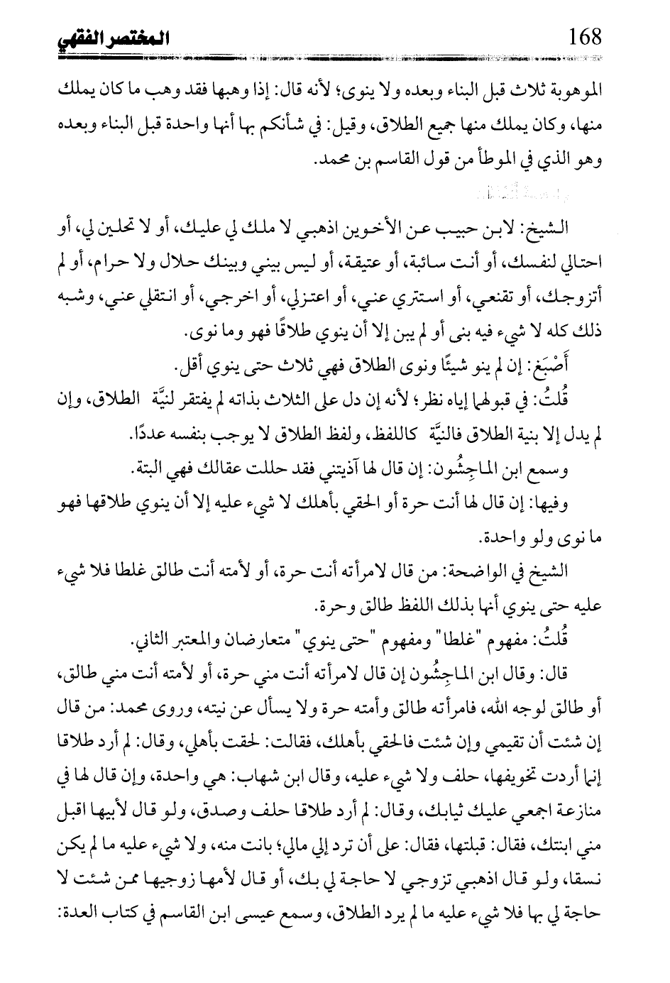 الشيخ: لابن حبيب عن الأخوين اذهبي لا ملك لي عليك، أو لا تحلين لي، أو احتالي لنفسك، أو أنت سائبة، أو عتيقة، أو ليس بيني وبينك حلال ولا حرام، أو لم أتزوجط، أو تقنعي، أو استتري عني، أو اعتزلي، أو اخرجي، أو انتقلي عني، وشبه ذلك كله لا شيء فيه بنى أو لم يبن إلا أن ينوي طلاقاً فهو وما نوى.