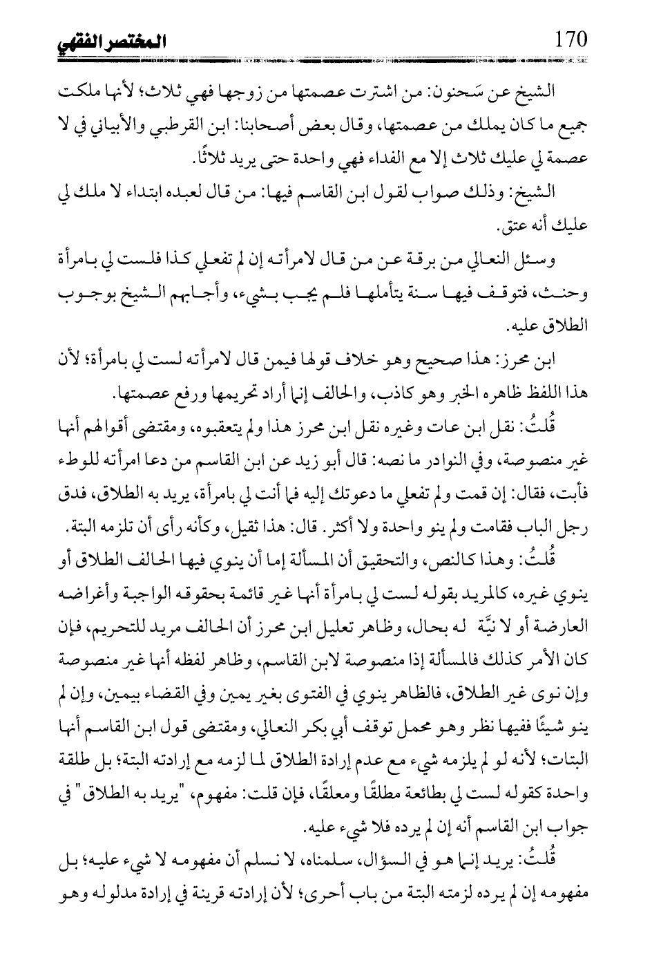 قُلتُ: نثل ابن عات وغيره نقل ابن محرز هذا ولم يتعقبوه، ومقتضى أقوالهم أنها غير منصوصة، وفي النوادر ما نصه: قال أبو زيد عن ابن القاسم من دعا امرأته للوطء فأبت، فقال: لإن قمت ولم تفعلي ما دعوتك إليه فما أنت لي بامرأة، يريد به الطلاق، فدق رجل الباب فقامت ولم ينو واحدة ولا أكثر. قال: هذا ثقيل، وكأنه رأى أن تلزمه البنة.