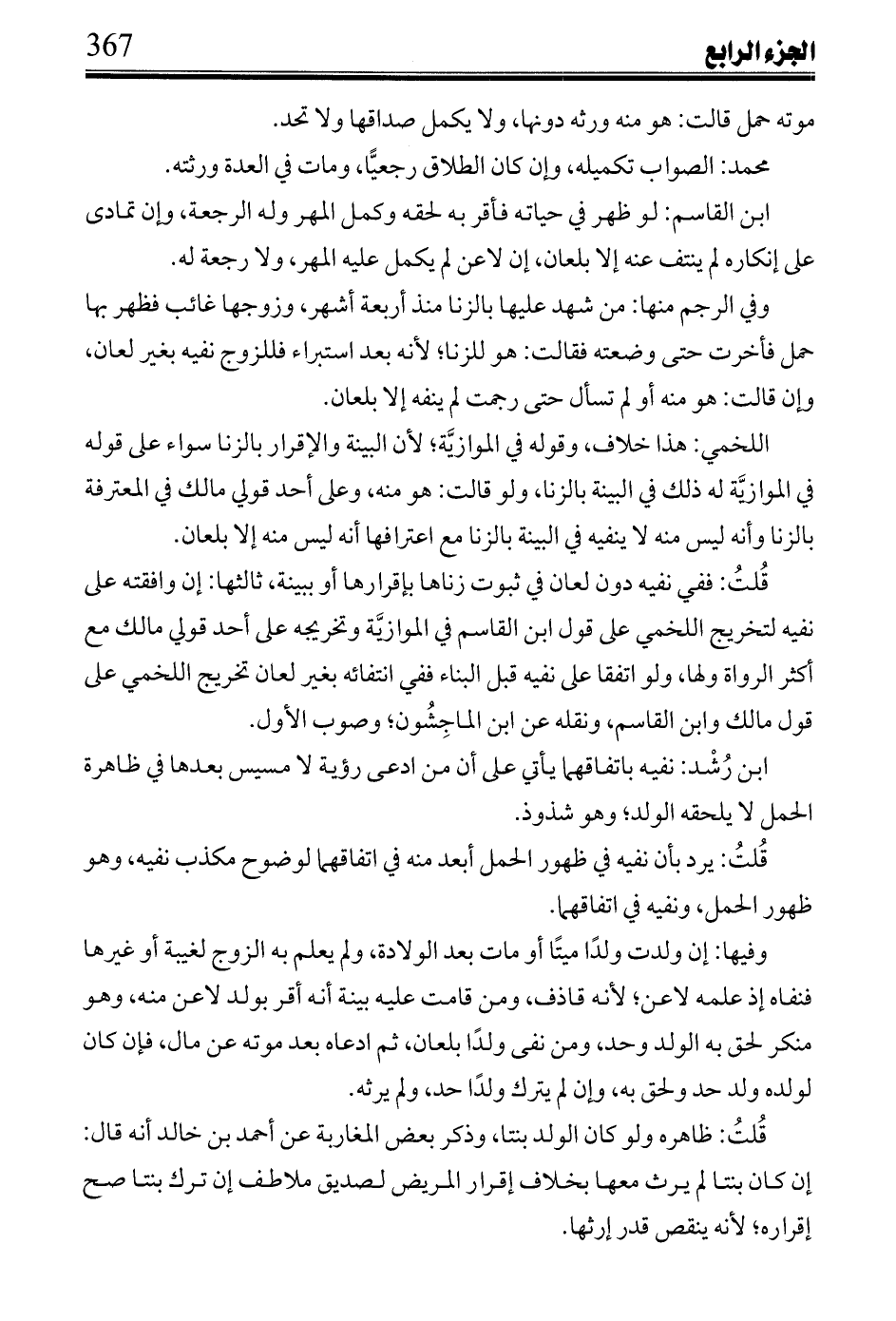 ابن رشد: نفيه باتفاقهما يأتي على أن من ادعى رؤية لا مسيس بعدها في ظاهرة الحمل لا يلحقه الولد؛ وهو شذوذ.