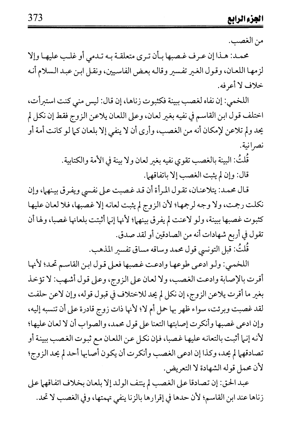 محمد: هذا إن عرف غصبها بأن ترى متعلقة به تدمي أو غلب عليها وإلا لزمها اللعان، وقول الغير تفسير وقاله بعض الفاسيين، ونقل ابن عبد السلام أنه خلاف لا أعرفه.