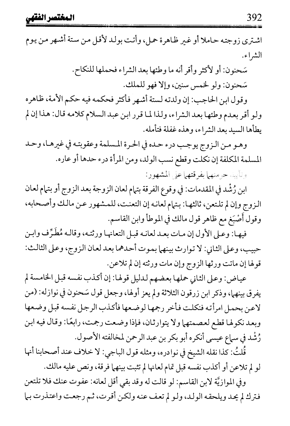 ابن رشد في المقدمات: في وقوع الفرقة بتمام لعان الزوجة بعد الزوج أو بتمام لعان الزوج وإن لم تلتعن، ثالثها: بتمام لعانه إن التعنت، للمشهور عن مالك وأصحابه، وقول أصبغ مع ظاهر قول مالك في الموطأ وابن القاسم.