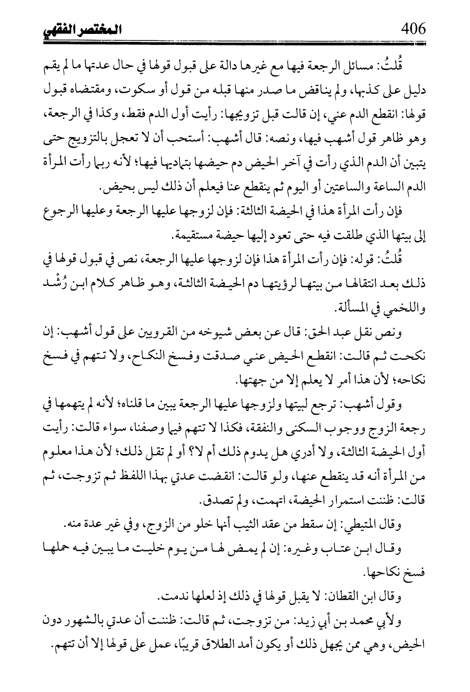 قلت: مسائل الرجعة فيها مع غيرها دالة على قبول قولها في حال عدتها ما لم يقم دليل على كذبها، ولم يناقض ما صدر منها قبله من قول أو سكوت، ومقتضاه قبول قولها: انقطع الدم عني، إن قالت قبل تزويجها: رأيت أول الدم فقط، وكذا في الرجعة، وهو ظاهر قول أشهب فيها، ونصه: قال أشهب: أستحب أن لا تعجل بالتزويج حتى يتبين أن الدم الذي رأت في آخر الحيض دم حيضها بتماديها فيها؛ لأنه ربما رأت المرأة الدم الساعة والساعتين أو اليوم ثم ينقطع عنا فيعلم أن ذلك ليس بحيض.