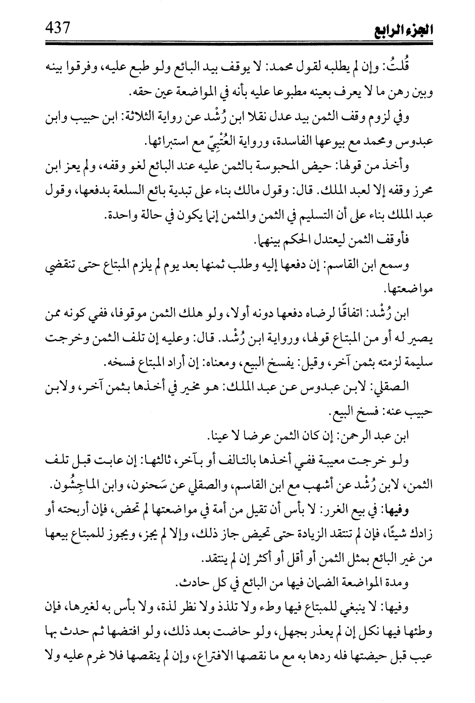 وفي لزوم وقف الثمن بيد عدل نقلا ابن رشد عن رواية الثلاثة: ابن حبيب وابن عبدوس ومحمد مع بيوعها الفاسدة، ورواية العتبي مع استبرائها.
