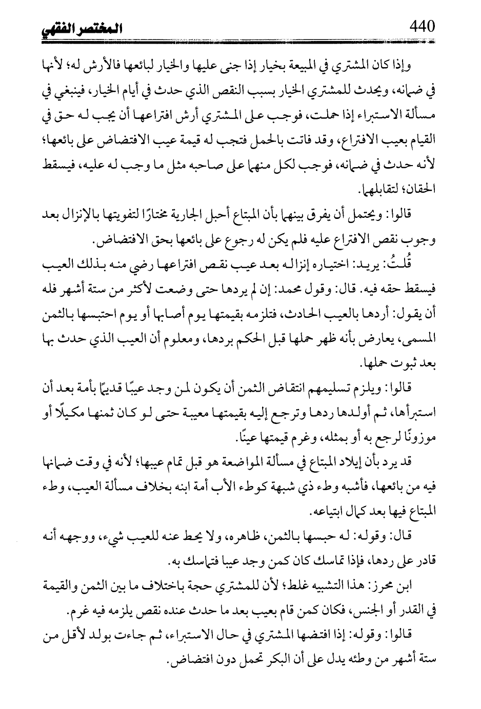قلت: يريد: اختياره إنزاله بعد عيب نقص افتراعها رضي منه بذلك العيب فيسقط حقه فيه. قال: وقول محمد: إن لم يردها حتي وضعت لأكثر من ستة أشهر فله أن يقول: أردها بالعيب بالحادث، فتلزمه بقيمتها يوم أصابها أو يوم احتبسها بالثمن المسمى، يعارض بأنه ظهر حملها قبل الحكم يردها، ومعلوم أن العيب الذي حدث بها بعد ثبوت حملها.