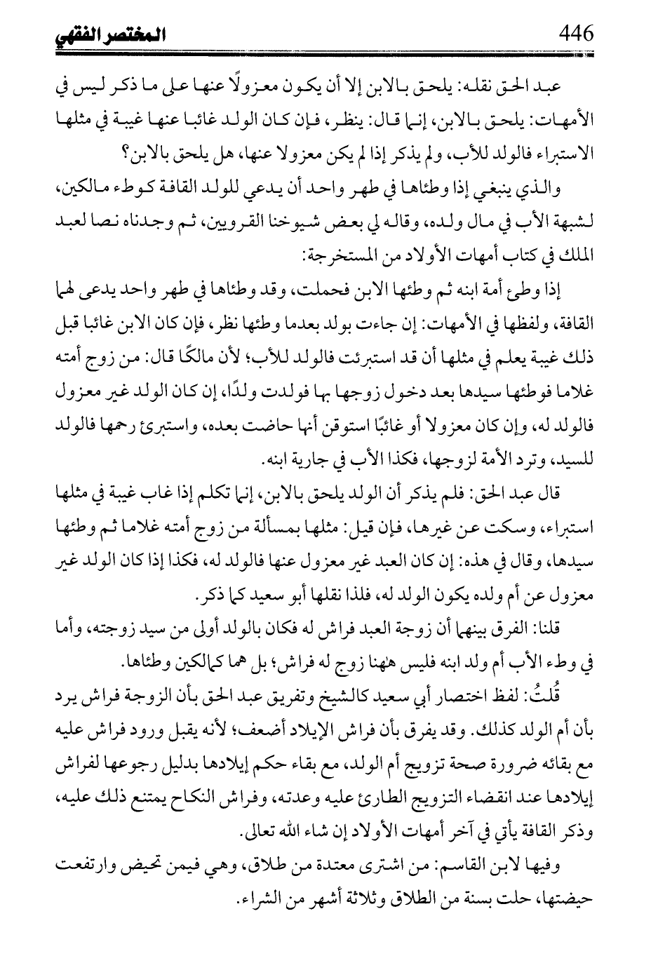 قُلتُ: لفظ اختصار أبي سعيد كالشيخ وتفريق عبد الحق بأن الزوجة فراش يرد بأن أم الولد كذلك. وقد يفرق بأن فراش الإيلاد أضعف؛ لأنه يقبل ورود فراش عليه مع بقائه ضرورة صحة تزويج أم الولد، مع بقاء حكم إيلادها بدليل رجوعها لفراش إيلادها عند انقضاء التزويج الطارئ عليه وعدته، وفراش النكاح يمتنع ذلك عليه، وذكر القافة بأتي في آخر أمهات الأولاد إن شاء الله تعالى.