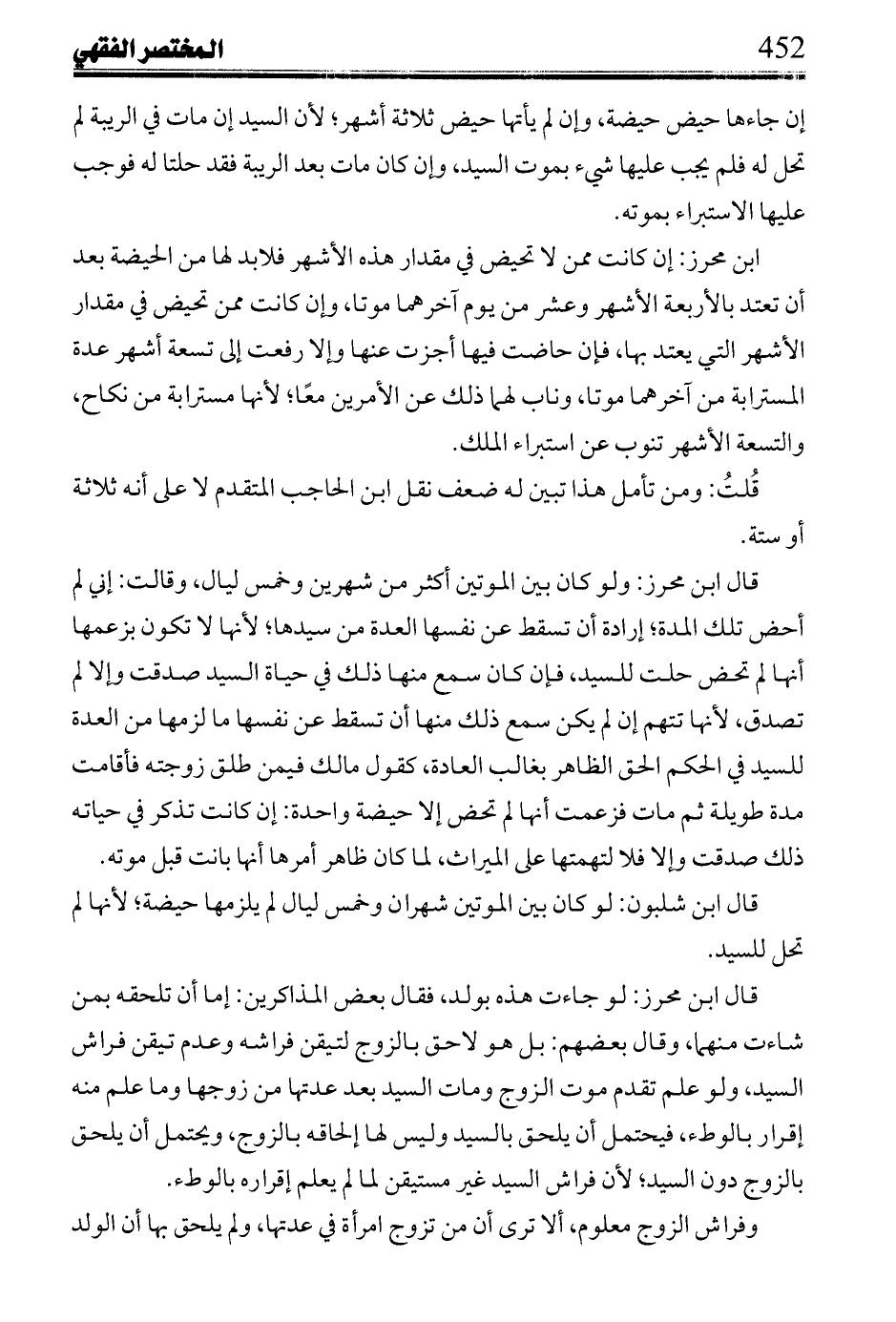 ابن محرز: إن كانت ممن لا تحيض في مقدار هذه الأشهر فلا بد لها من الحيضة بعد أن تعتد بالأربعة الأشهر وعشر من يوم آخرهما موتا، وإن كانت ممن تحيض في مقدار الأشهر التي يعتد بها، فإن حاضت فيها أجزت عنها وإلا رفعت إلى تسعة أشهر عدة المسترابة من آخرهما موتا، وناب لها ذلك عن الأمرين معًا؛ لأنها مسترابة من نكاح، والتسعة الأشهر تنوب عن استبراء الملك.