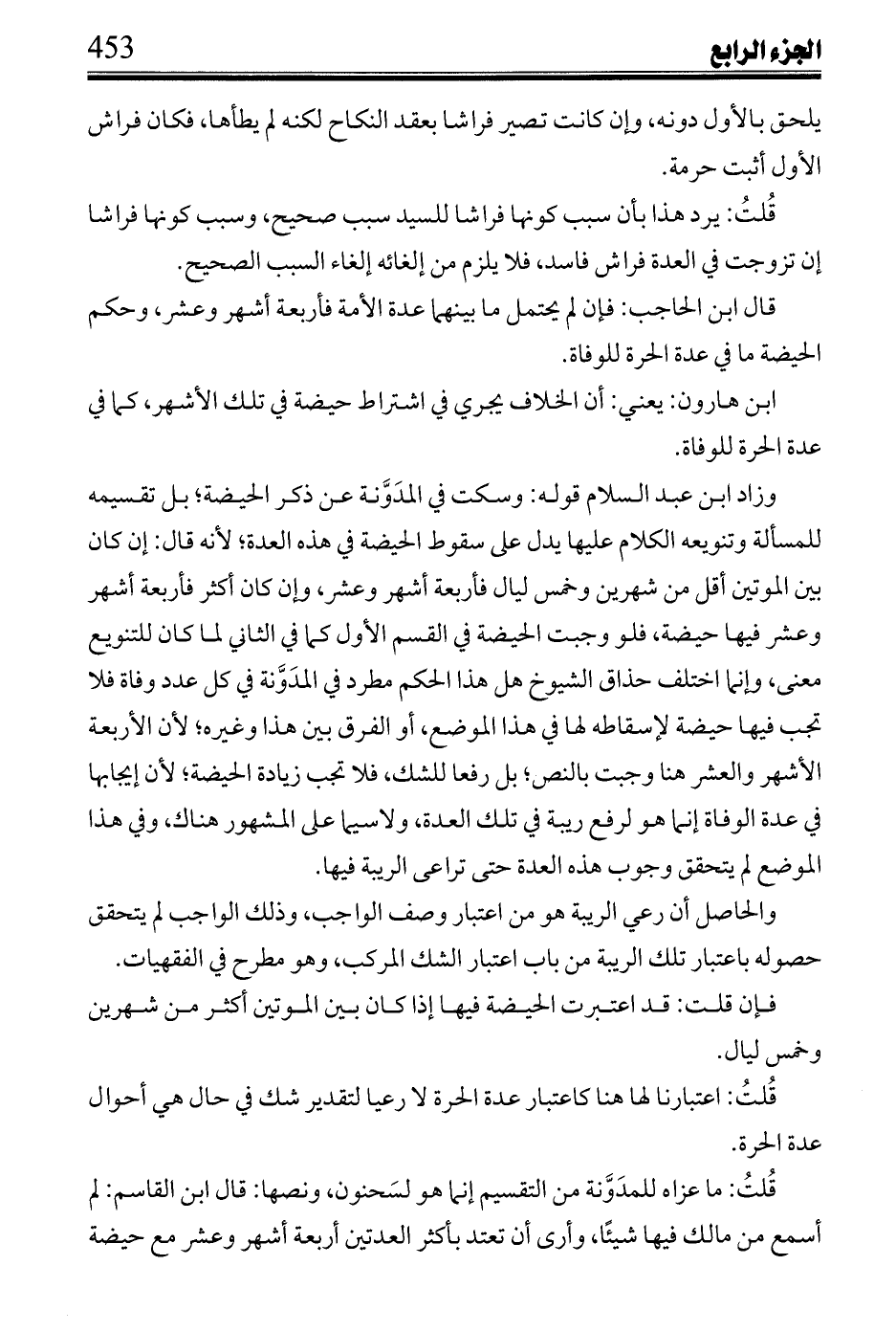 وزاد ابن عبد السلام قوله: وسكت في المدَوَّنة عن ذكر الحيضة؛ بل تقسيمه للمسألة وتنويعه الكلام عليها يدل على سقوط الحيضة في هذه العدة؛ لأنه قال: إن كان بين الموتين أقل من شهرين وخمس ليال فأربعة أشهر وعشر، وإن كان أكثر فأربعة أشهر وعشر فيها حيضة، فلو وجبت الحيضة في القسم الأول كما في الثاني لما كان للتنويع معنى، وإنما اختلف حذاق الشيوخ هل هذا الحكم مطرد في المدَوَّنة في كل عدد وفاة فلا تجب فيها حيضة لإسقاطه لها في هذا الموضع، أو الفرق بين هذا وغيره؛ لأن الأربعة الأشهر والعشر هنا وجبت بالنص؛ بل رفعا للشك، فلا تجب زيادة الحيضة؛ لأن إيجابها في عدة الوفاة إنما هو لرفع ريبة في تلك العدة، ولا سيما على المشهور هناك، وفي هذا الموضع لم يتحقق وجوب هذه العدة حتى تراعى الريبة فيها.