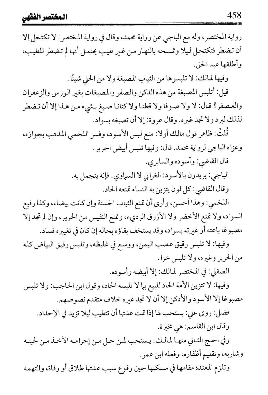 وفيها: لا تلبس رقيق عصب اليمن، ووسع في غليظه، وتلبس رقيق البياض كله من الحرير وغيره، ولا تلبس خزا.