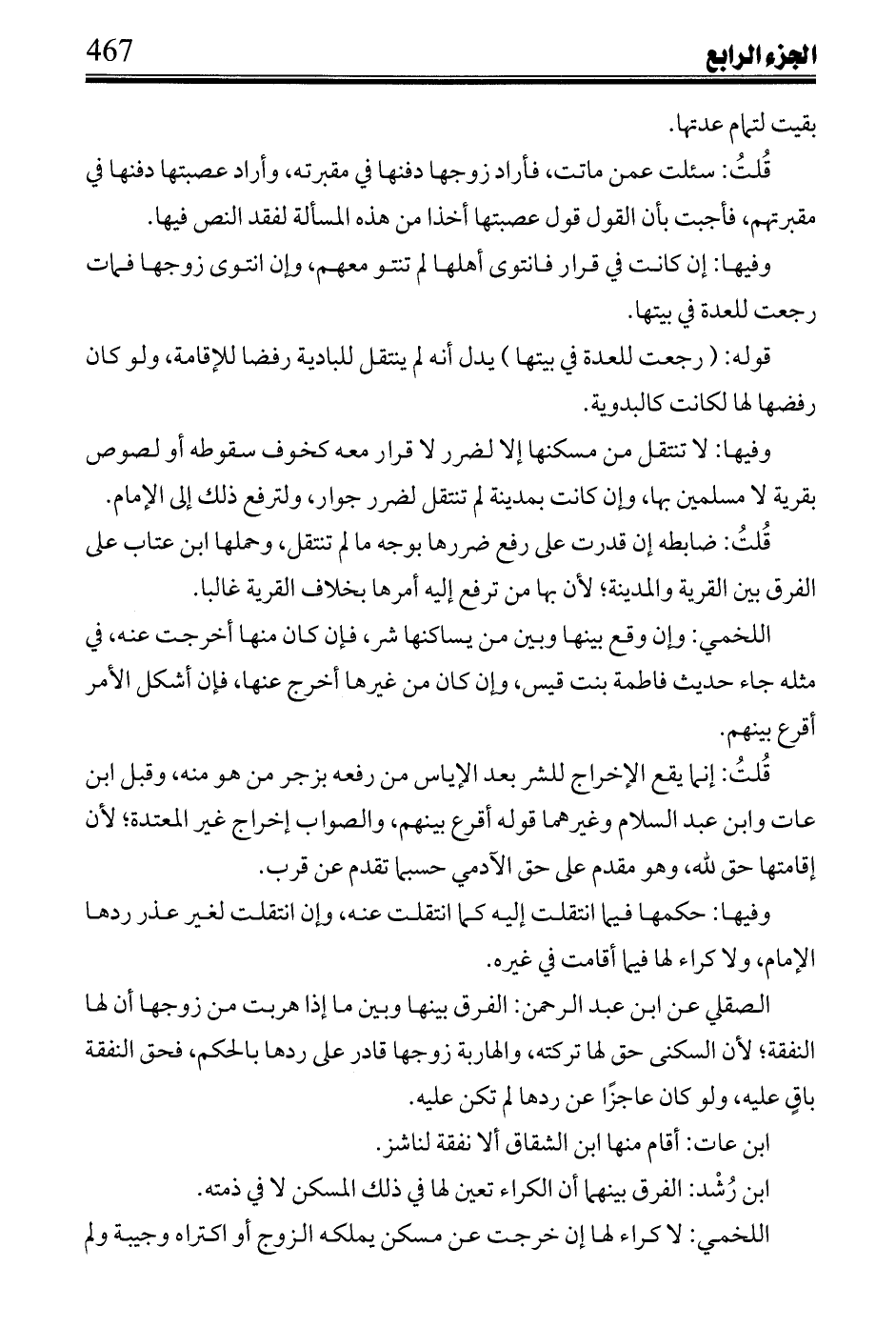 وفيها: لا تنتقل من مسكنها إلا لضرر لا قرار معه كخوف سقوطه أو لصوص بقرية لا مسلمين بها، وإن كانت بمدينة لم تنتقل لضرر جوار، ولترفع ذلك إلى الإمام.