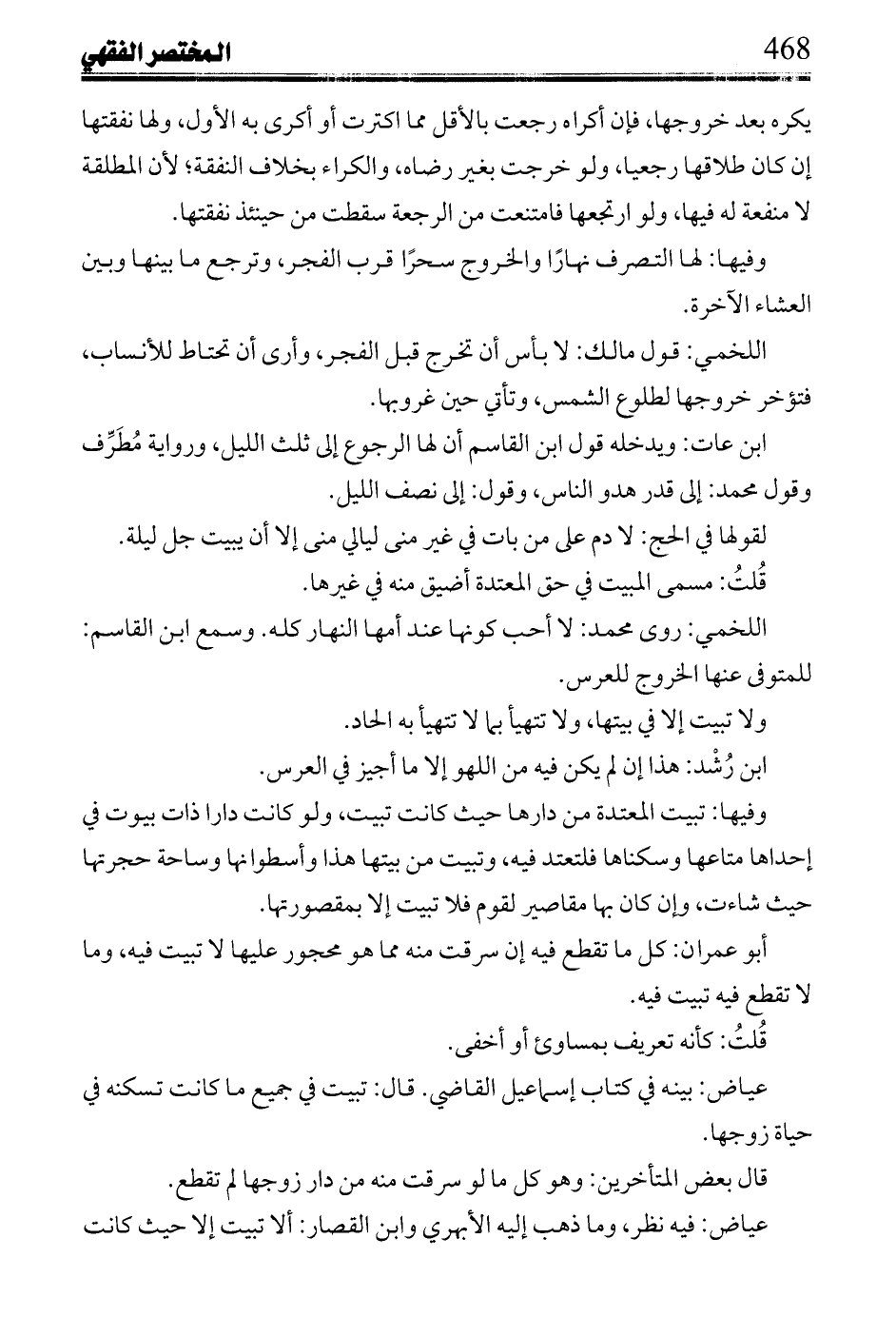 عياض: بينه في كتاب إسماعيل القاضي. قال: تبيت في جميع ما كانت تسكنه في حياة زوجها.
