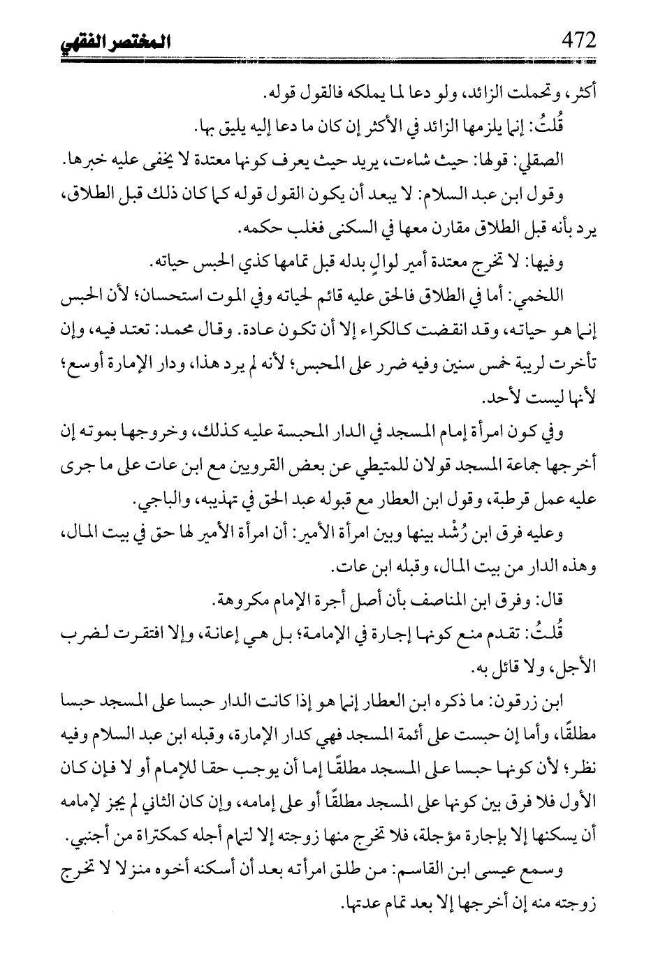 ابن زرقون: ماذكره ابن العطار إنما هو إذا كانت الدار حبسا على المسجد حبسا مطلقًا، وأما إن حبست على أثمة المسجد فهي كدار الإمارة، وقبله ابن عبدالسلام وفيه نظر، لأن كونها حبسا على المسجد مطلقًا إما أن يوجب حقًا للإمام أو لا فإن كان الأول فلافرق بين كونها على المسجد مطلقً أو على إمامه، وإن كان الثاني لم يجز لإمامه أن يسكنها إلا بإجارة مؤجلة، فلا تخرج منها زوجته إلا لتمام أجله كمكتراة من أجنبي.