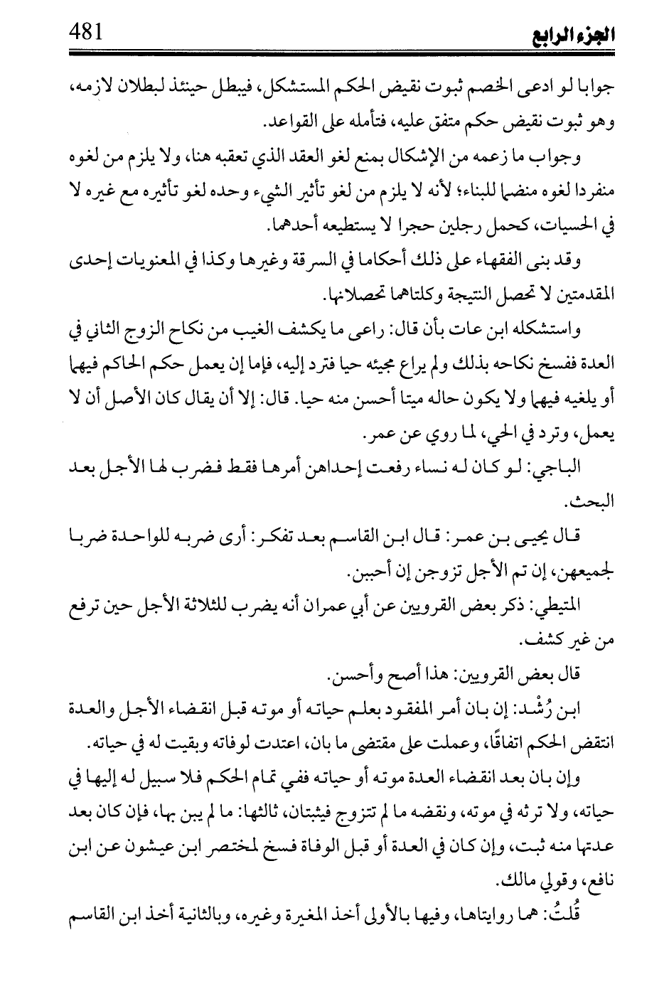 واستشكله ابن عات بأن قال: راعى ما يكشف الغيب من نكاح الزوج الثاني في العدة ففسخ نكاحه بذلك ولم يراع مجيئه حياً فترد إليه، فإما إن يعمل حكم الحاكم فيهما أو يلغيه فيهما ولا يكون حاله ميتاً أحسن منه حياً. فال: إلا أن يقال كان الأصل أن لا يعمل، وترد في الحي، لما روي عن عمر.