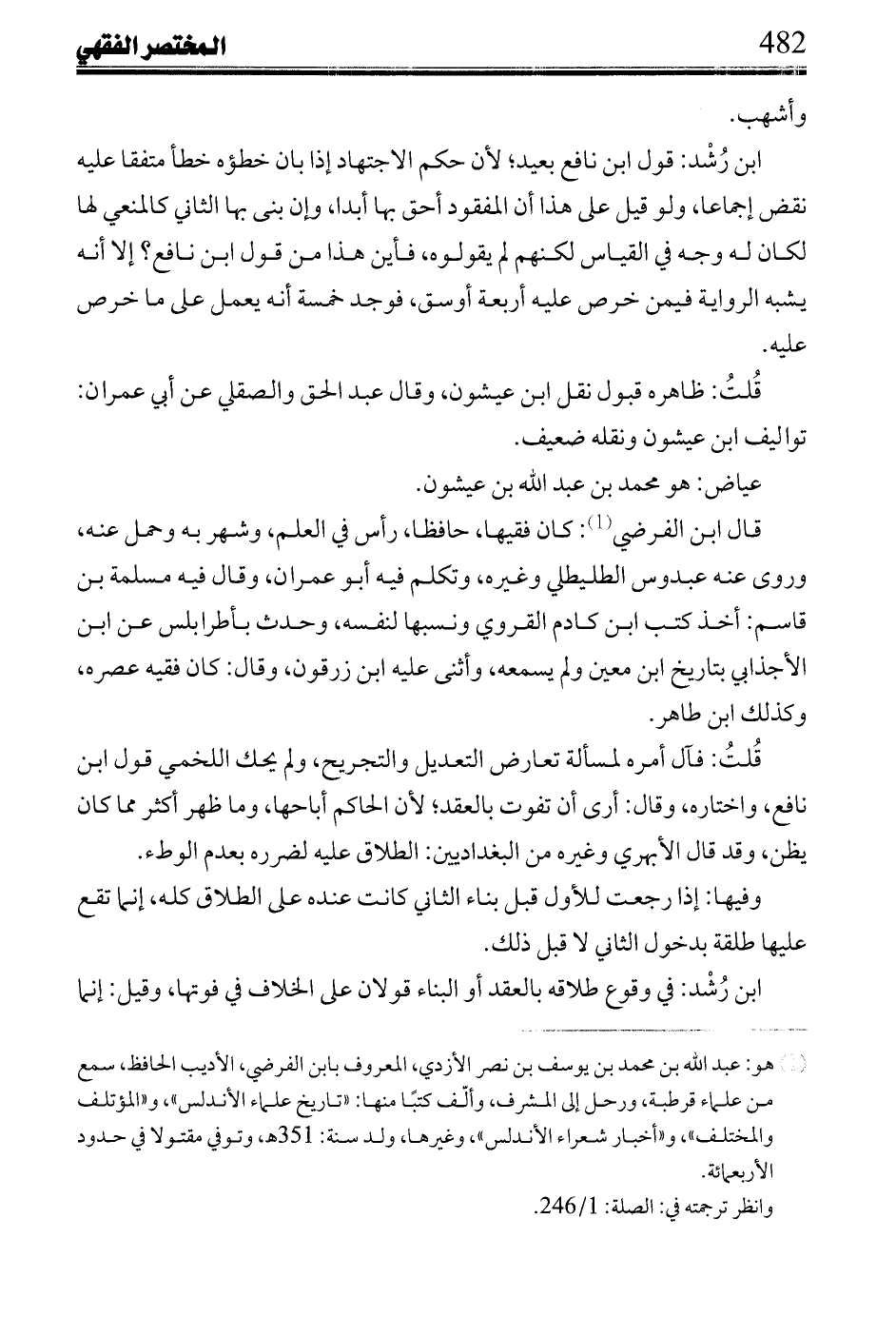 قُلتُ: ظاهره قبول نقل ابن عيشون، وقال عبد الحق والصقلي عن أبي عمران: تأليف ابن عيشون ونقله ضعيف.