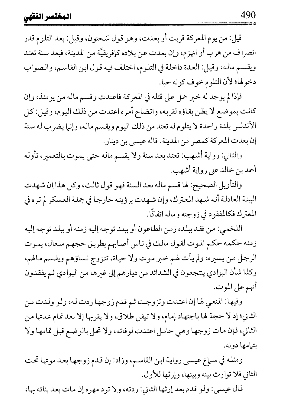 والتأويل الصحيح: لها قسم ماله بعد السنة فهو قول ثالث، وكل هذا إن شهدت البينة العادلة أنه شهد المعترك، وغن شهدت برؤيته خارجاً في جملة العسكر لم تره في المعترك فكالمفقود في زوجته وماله اتفاقاً.