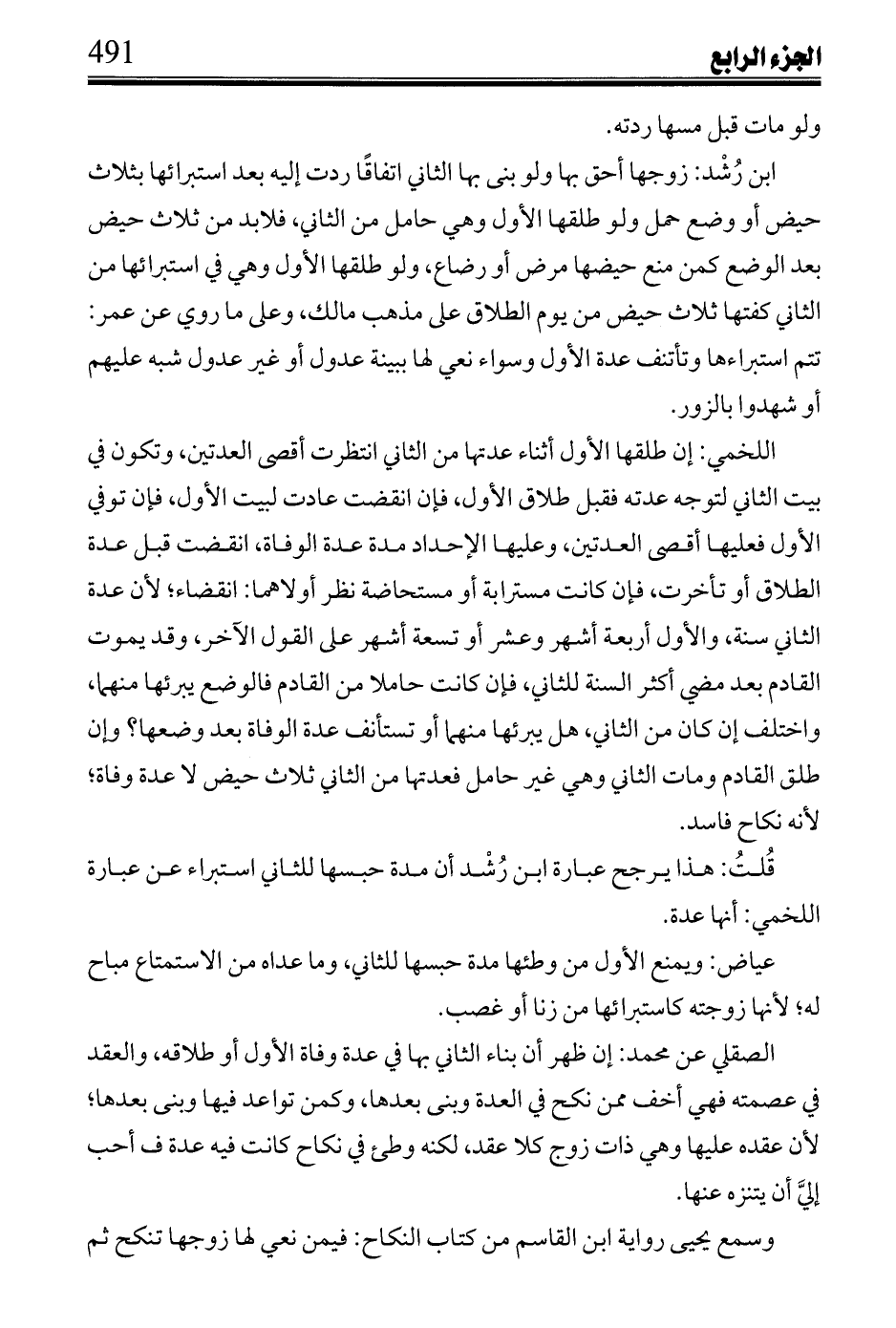 ابن رُشد: زوجها أحق بها ولو بنى بها الثاني اتفاقاً ردت إليه بعد استبرائها بثلاث حيض أو وضع حمل ولو طلقها الأول وهي حامل من الثاني، فلابد من ثلاث حيض بعد الوضع كمن منع حيضها مرض أو رضاع، ولو طلقها الأول وهي في استبرائها من الثاني كفتها ثلاث حيض من يوم الطلاق على مذهب مالك، وعلى ما روي عن عمر: تتم استبراءها وتأتنف عدة الأول وسواء نعي لها ببينة عدول أو غير عدول شبه عليهم أو شهدوا بالزور.