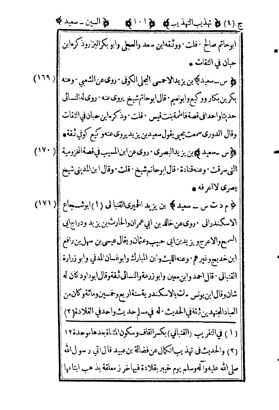171- "م د ت س – سعيد" بن يزيد الحميري القتباني1 أبو شجاع الإسكندراني روى عن خالد بن أبي عمران والحارث بن يزيد ودراج أبي السمح والأعرج ويزيد بن حبيب وعثمان ويقال عيسى بن سهل بن رافع بن خديج وغيرهم وعنه الليث وابن المبارك وأبو غسان المدني وأبو زرارة القتباني قال أحمد وابن معين وأبو زرعة والنسائي ثقة وقال أبو داود كان له شأن وقال ابن يونس مات بالإسكندرية سنة أربع وخمسين ومائة وكان العباد المجتهدين ثقة في الحديث له في مسلم حديث واحد في القلادة2