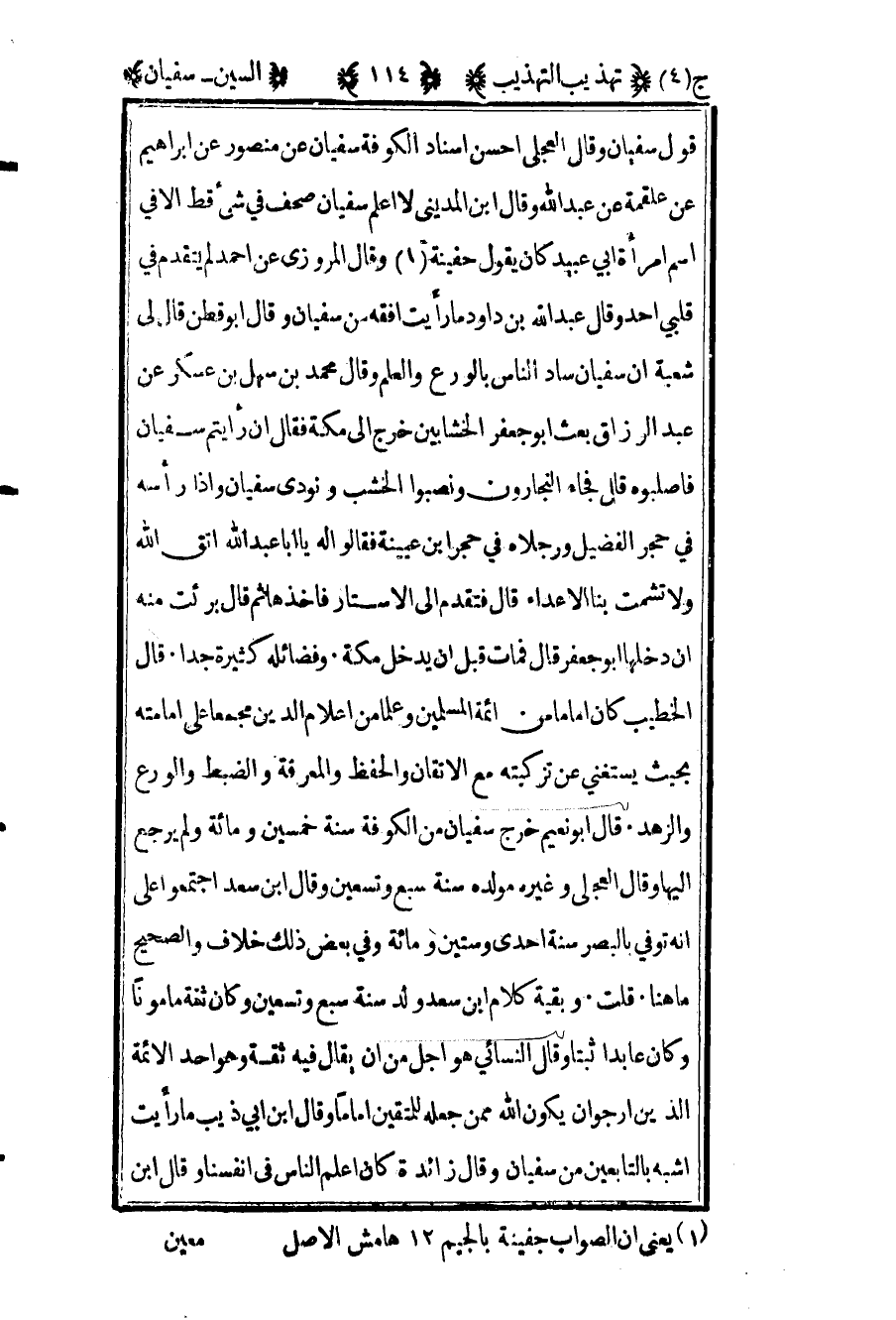 قول سفيان وقال العجلي أحسن إسناد الكوفة عن منصور عن إبراهيم عن علقمة عن عبد الله وقال ابن المديني لا أعلم سفيان صحف في شيء قط إلا في اسم امرأة أبي عبيد كان يقول حفينة1 وقال المروزي عن أحمد لم يتقدم في قلبي أحد وقال عبد الله بن داود ما رأيت أفقه من سفيان وقال أبو قطن قال لي شعبة أن سفيان ساد الناس بالورع والعلم وقال محمد بن سهل بن عسكر عن عبد الرزاق بعث أبو جعفر الخشابين خرج إلى مكة فقال أن رأيتم سفيان فاصلبوه قال فجاء النجارون ونصبوا الخشب ونودي سفيان وإذا رأسه في حجر الفضيل ورجلاه في حجر بن عيينة فقالوا له يا أبا عبد الله اتق الله ولا تشمت بنا الأعداء قال فتقدم إلى الأستار فأخذها ثم قال برئت منه أن دخلها أبو جعفر قال فمات قبل أن يدخل مكة وفضائله كثيرة جدا قال الخطيب كان إماما من أئمة المسلمين وعلما من أعلام الدين مجمعا على إمامته بحيث يستغنى عن تزكيته مع الإتقان والحفظ والمعرفة والضبط والورع والزهد قال أبو نعيم خرج سفيان من الكوفة سنة خمسين ومائة ولم يرجع إليها وقال العجلي وغيره مولده سنة سبع وتسعين وقال ابن سعد اجتمعوا على أنه توفي بالبصرة سنة إحدى وستين ومائة وفي بعض ذلك خلاف والصحيح ما هنا قلت وبقية كلام بن سعد ولد سنة سبع وتسعين وكان ثقة مأمونا وكان عابدا ثبتا وقال النسائي هو أجل من أن يقال فيه ثقة وهو أحد الأئمة الذين أرجو أن يكون الله ممن جعله للمتقين إماما وقال ابن أبي ذيب ما رأيت أشبه بالتابعين من سفيان وقال زائدة كان أعلم الناس في أنفسنا وقال ابن
