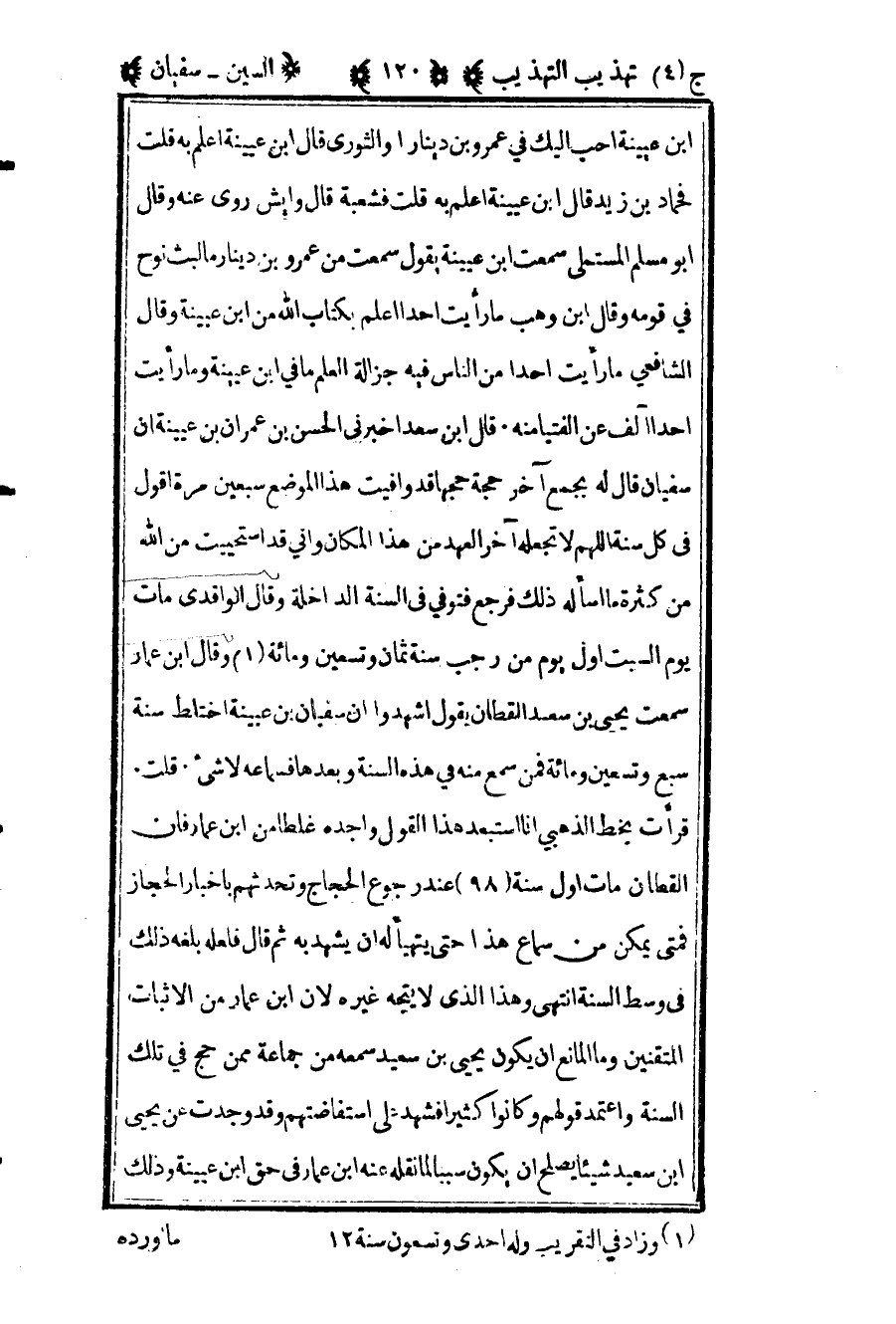 ابن عيينة أحب إليك في عمرو بن دينار أو الثوري قال ابن عيية أعلم به قلت فحماد بن زيد قال ابن عيينة أعلم به فقلت فشعبة قال وأيش روى عنه وقال أبو مسلم المستملي سمعت بن عيينة يقول سمعت عمرو بن دينار ما لبث نوح في قومه وقال ابن وهب ما رأيت أحدا أعلم بكتاب الله من بن عيينة وقال الشافعي ما رأيت أحدا من الناس فيه جزالة العلم ما في بن عيينة وما رأيت أحدا آلف عن الفتيا منه قال ابن سعد أخبرني الحسن بن عمران بن عيينة أن سفيان قال له بجمع آخر حجة حجها قد وافيت هذا الموضع سبعين مرة أقول في كل سنة اللهم لا تجعله آخر العهد من هذا المكان وإني قد استحييت من الله من كثرة ما أسأله ذلك فرجع فتوفي في السنة الداخلة وقال الواقدي مات يوم السبت أول يوم من رجب سنة ثمان وتسعين ومائة1 وقال ابن عمار سمعت يحيى بن سعيد القطان يقول إشهدوا أن سفيان بن عيينة اختلط سنة سبع وتسعين ومائة فمن سمع منه في هذه السنة وبعدها فسماعه لا شيء قلت قرأت بخط الذهبي أنا استبعد هذا القول وأجده غلطا من بن عمار فإن القطان مات أول سنة "98" عند رجوع الحجاج وتحدثهم بأخبار الحجاز فمتى يمكن من سماع هذا حتى يتهيأ له أن يشهد به ثم قال فلعله بلغه ذلك في وسط السنة انتهى وهذا الذي لا يتجه غيره لأن بن عمار من الاثبات المتقنين وما المانع أن يكون يحيى بن سعيد سمعه من جماعة ممن حج في تلك السنة واعتمد قولهم وكانوا كثيرا فشهد على استفاضتهم وقد وجدت عن يحيى بن سعيد شيئا يصلح أن يكون سببا لما نقله عنه بن عمار في حق ابن عيينة وذلك