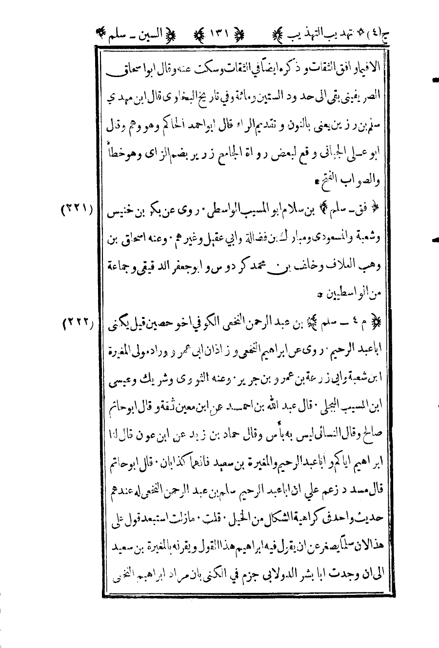 222- "م 4 – سلم" بن عبد الرحمن النخعي الكوفي أخو حصين قيل يكنى أبا عبد الرحيم روى عن إبراهيم النخعي وزاذان أبي عمر ووراد مولى المغيرة بن شعبة وأبي زرعة بن عمرو بن جرير وعنه الثوري وشريك وعيسى بن المسيب البجلي قال عبد الله بن أحمد عن ابن معين ثقة وقال أبو حاتم صالح وقال النسائي ليس به بأس وقال حماد بن زيد عن ابن عون قال لنا إبراهيم إياكم وأبا عبد الرحيم والمغيرة بن سعيد فإنهما كذابان قال أبو حاتم قال مسدد زعم علي أن أبا عبد الرحيم سلم عبد الرحمن النخعي له عندهم حديث واحد في كراهته الشكال من الخيل قلت ما زلت استبعد قول علي هذا لأن سلما يصغر عن أن يقول فيه إبراهيم هذا القول ويقرنه بالمغيرة بن سعد إلى أن وجدت أبا بشر الدولابي جزم في الكنى بان مراد إبراهيم النخعي