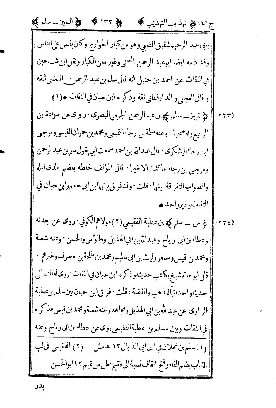 224- "س – سلم" بن عطية الفقيمي2 مولاهم الكوفي روى عن جدته وعطاء بن أبي رباح وعبد الله بن أبي الهذيل وطاووس والحسن وعنه شعبة ومحمد بن قيس ومسعر وليث بن أبي سليم ومحمد بن طلحة بن مصرف وغيرهم قال أبو حاتم شيخ يكتب حديثه وذكره ابن حبان في الثقات روى له النسائي حديثا واحدا تبا للذهب والفضة قلت فرق بن حبان بين سلم بن عطية الراوي عن عبد الله بن أبي الهذيل ومجاهد وعنه شعبة ومحمد بن قيس فذكره في الثقات وبين مسلم بن عطية الفقيمي روى عن عطاء بن أبي رباح وعنه