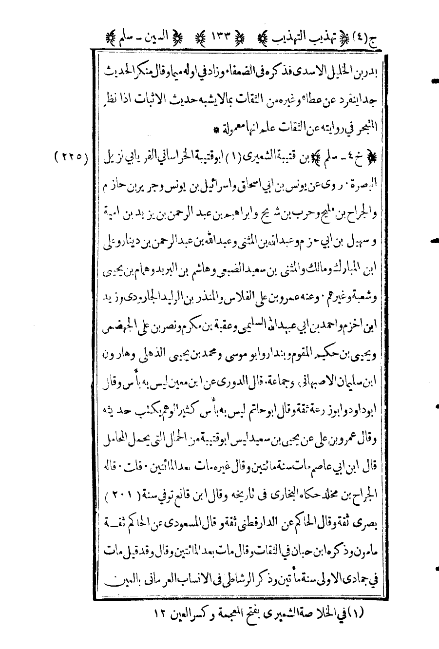 225- "خ 4 – سلم" بن قتيبة الشعيري1 أبو قتيبة الخراساني الفريابي نزيل البصرة روى عن يونس بن أبي إسحاق وإسرائيل بن يونس وجرير بن حازم والجراح بن مليح وحرب بن شريح وإبراهيم بن عبد الرحمن بن يزيد بن أمية وسهيل بن أبي حزم وعبد الله بن المثنى وعبد الله بن عبد الرحمن بن دينار وعلي بن المبارك ومالك والمثنى بن سعيد الضبعي وهاشم بن البريد وهمام بن يحيى وشعبة وغيرهم وعنه عمرو بن علي الفلاس والمنذر بن الجارودي وزيد بن أخزم وأحمد بن عبد الله السليمي وعقبة بن مكرم ونصر بن علي الجهضمي ويحيى بن حكيم المقوم وبندار وأبو موسى ومحمد بن يحيى الذهلي وهارون بن سليمان الأصبهاني وجماعة قال الدوري عن ابن معين ليس به بأس وقال أبو داود وأبو زرعة ثقة وقال أبو حاتم ليس به بأس كثير الوهم يكتب حديثه وقال عمرو بن علي عن يحيى بن سعيد ليس أبو قتيبة من الحمال التي يحمل المحامل قال ابن أبي عاصم مات سنة مائتين وقال غيره مات بعد المائتين قلت قاله الجراح بن مخلد حكاه البخاري في تاريخه وقال ابن قانع توفي سنة "201" بصري ثقة وقال الحاكم عن الدارقطني ثقة وقال المسعودي عن الحاكم ثقة مأمون وذكره ابن حبان في الثقات وقال مات بعد المائتين وقال قد قيل مات في جمادى الأولى سنة مائتين وذكر الرشاطي في الأنساب العرماني بالعين