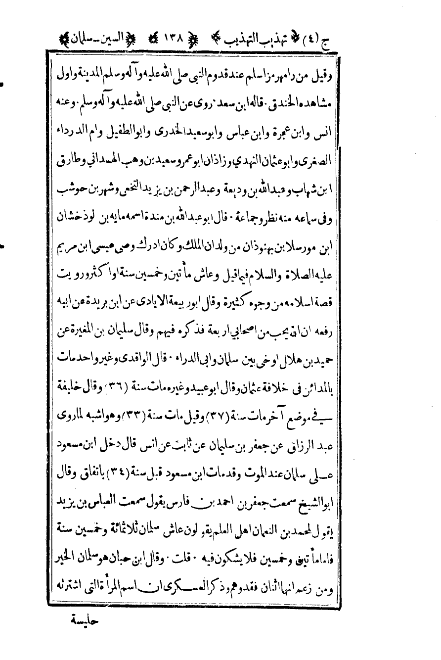 وقيل من رامهرمز أسلم عند قدوم النبي صلى الله عليه وآله وسلم المدينة وأول مشاهده الخندق قاله بن سعد روى عن النبي صلى الله عليه وآله وسلم وعنه أنس وابن عجرة وابن عباس وأبو سعيد الخدري وأبو الطفيل وأم الدرداء الصغري وأبو عثمان النهدي وزاذان أبو عمر وسعيد بن وهب الهمداني وطارق بن شهاب وعبد الله بن وديعة وعبد الرحمن بن يزيد النخعي وشهر بن حوشب وفي سماعه منه نظر وجماعة قال أبو عبد الله بن مندة اسمه مايه بن لوذخشان بن مورسلا بن بهنوذان من ولدان الملك وكان أدرك وصي عيسى بن مريم عليه السلام فيما قيل وعاش مائتين وخمسين سنة أو أكثر ورويت قصة إسلامه من وجوه كثيرة وقال أبو ربيعة الأيادي عن أبي بريدة عن أبيه رفعه أن الله يحب من أصحابي أربعة فذكره فيهم وقال سليمان بن المغيرة عن حميد بن هلال اوخى بين سلمان وأبي الدرداء قال الواقدي وغير واحد مات بالمدائن في خلافة عثمان وقال أبو عبيد وغيره مات سنة "36" وقال خليفة في موضع آخر مات سنة "37" وقيل مات سنة "33" وهو أشبه لما روى عبد الرزاق عن جعفر بن سليمان عن ثابت عن أنس قال دخل بن مسعود على سلمان عند الموت وقد مات بن مسعود قبل سنة "34" باتفاق وقال أبو الشيخ سمعت جعفر بن أحمد بن فارس يقول سمعت العباس بن يزيد يقول لمحمد بن النعمان أهل العلم يقولون عاش سلمان ثلاثمائة وخمسين سنة فأما مائتين وخمسين فلا يشكون فيه قلت وقال ابن حبان هو سلمان الخير ومن زعم إنهما اثنان فقد وهم وذكر العسكري أن اسم المرأة التي اشترته