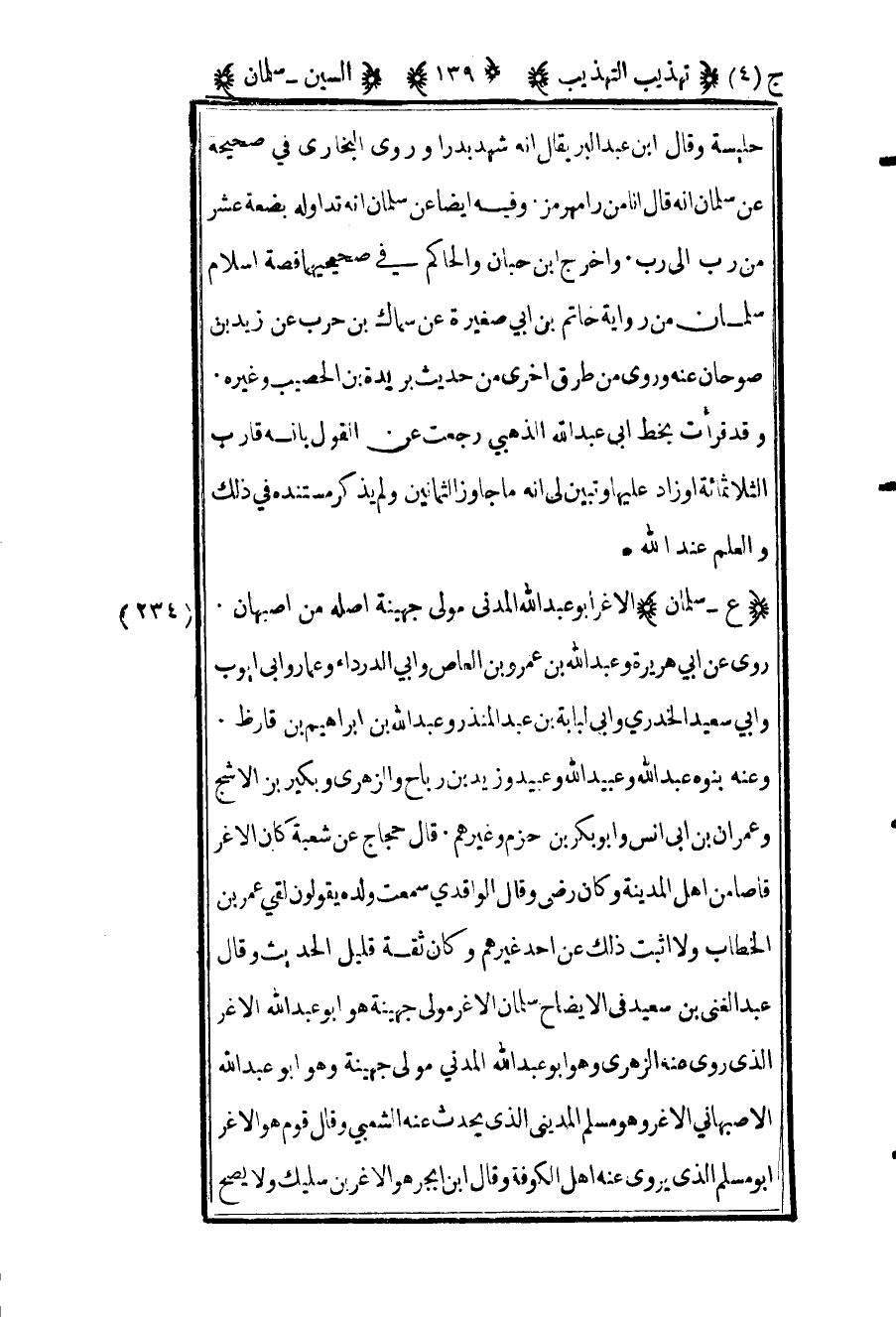 234- "ع – سلمان" الأغر أبو عبد الله المدني مولى جهينة أصله من أصبهان روى عن أبي هريرة وعبد الله بن عمرو بن العاص وأبي الدرداء وعمار وأبي أيوب وأبي سعيد الخدري وأبي لبابة بن عبد المنذر وعبد الله بن إبراهيم بن قارظ وعنه بنوه عبد الله وعبيد الله وعبيد وزيد بن رباح والزهري وبكير بن الأشج وعمران بن أبي أنس وأبو بكر بن حزم وغيرهم قال حجاج عن شعبة كان الأغر قاصا من أهل المدينة وكان رضي وقال الواقدي سمعت ولده يقولون لقي عمر بن الخطاب ولا أثبت ذلك عن أحد غيرهم وكان ثقة قليل الحديث وقال عبد الغني بن سعيد في الإيضاح سلمان الأغر مولى جهينة هو أبو عبد الله الأغر الذي روى عنه الزهري وهو أبو عبد الله المدني مولى جهينة وهو أبو عبد الله الأصبهاني الأغر وهو مسلم المديني الذي يحدث عنه الشعبي وقال قوم هو الأغر أبو مسلم الذي يروي عنه أهل الكوفة وقال ابن أبجر هو الأغر بن سليك ولا يصح