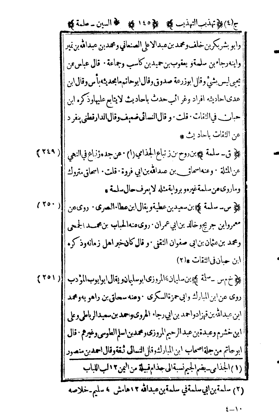 251- "خ م س – سلمة" بن سليمان المروزي3 أبو سليمان ويقال أبو أيوب المؤدب روى عن ابن المبارك وأبي حمزة السكري وعنه إسحاق بن راهويه ومحمد بن عبد الله بن قهزاد وأحمد بن أبي رجاء الهروي وأحمد بن سعيد الرباطي وعلي بن خشرم وعبدة بن عبد الرحيم المروزي ومحمد بن أسلم الطوسي وغيرهم قال أبو حاتم من جلة أصحاب بن المبارك وقال النسائي ثقة وقال أحمد بن منصور