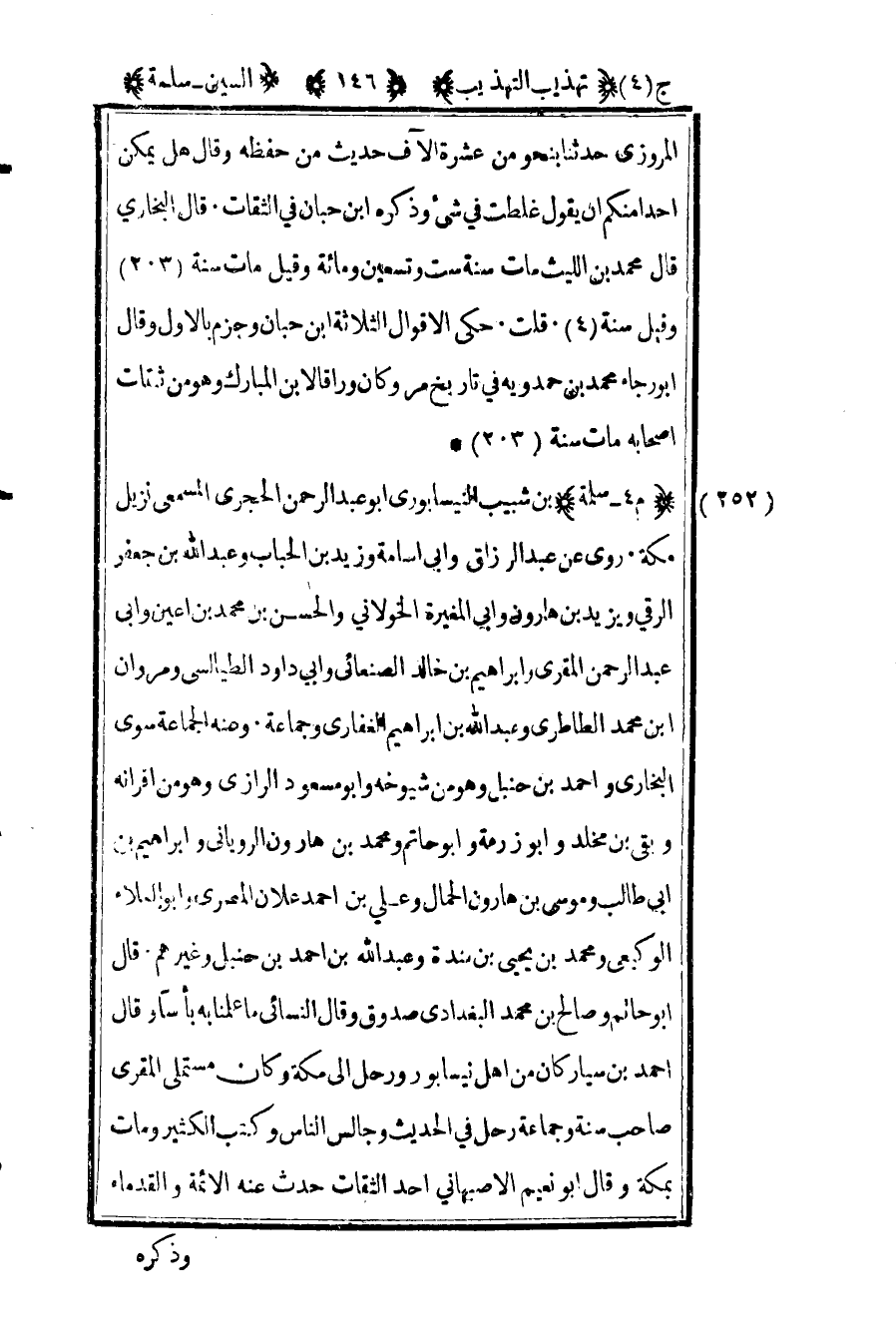 252- "م 4 – سلمة" بن شبيب النيسابوري أبو عبد الرحمن الحجري المسمعي نزيل مكة روى عن عبد الرزاق وأبي أسامة وزيد بن الحباب وعبد الله بن جعفر الرقي ويزيد بن هارون وأبي المغيرة الخولاني والحسن بن محمد بن أعين وأبي عبد الرحمن المقري وإبراهيم بن خالد الصنعاني وأبي داود الطيالسي ومروان بن محمد الطاطري وعبد الله بن إبراهيم الغفاري وجماعة وعنه الجماعة سوى البخاري وأحمد بن حنبل وهو من شيوخه وأبو مسعود الرازي وهو من أقرانه وبقي بن مخلد وأبو زرعة وأبو حاتم ومحمد بن هارون الروياني وإبراهيم بن أبي طالب وموسى بن هارون الحمال وعلي بن أحمد علان المصري وأبو العلاء الوكيعي ومحمد بن يحيى بن مندة وعبد الله بن أحمد بن حنبل وغيرهم قال أبو حاتم وصالح بن محمد البغدادي صدوق وقال النسائي ما علمنا به بأسا وقال أحمد بن سيار كان من أهل نيسابور ورحل إلى مكة وكان مستملي المقري صاحب سنة وجماعة رحل في الحديث وجالس الناس وكتب الكثير ومات بمكة وقال أبو نعيم الأصبهاني أحد الثقات حدث عنه الأئمة والقدماء