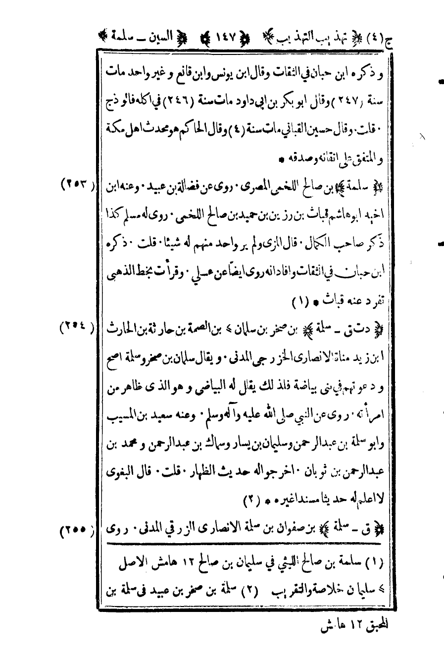 253- "سلمة" بن صالح اللخمي المصري روى عن فضالة بن عبيد وعنه بن أخيه أبو هاشم قباث بن رزين بن حميد بن صالح اللخمي روى له مسلم كذا ذكر صاحب الكمال قال المزي ولم يرو أحد منهم له شيئا قلت ذكره ابن حبان في الثقات وأفاد أنه روى أيضا عن علي وقرأت بخط الذهبي تفرد عنه قباث.1