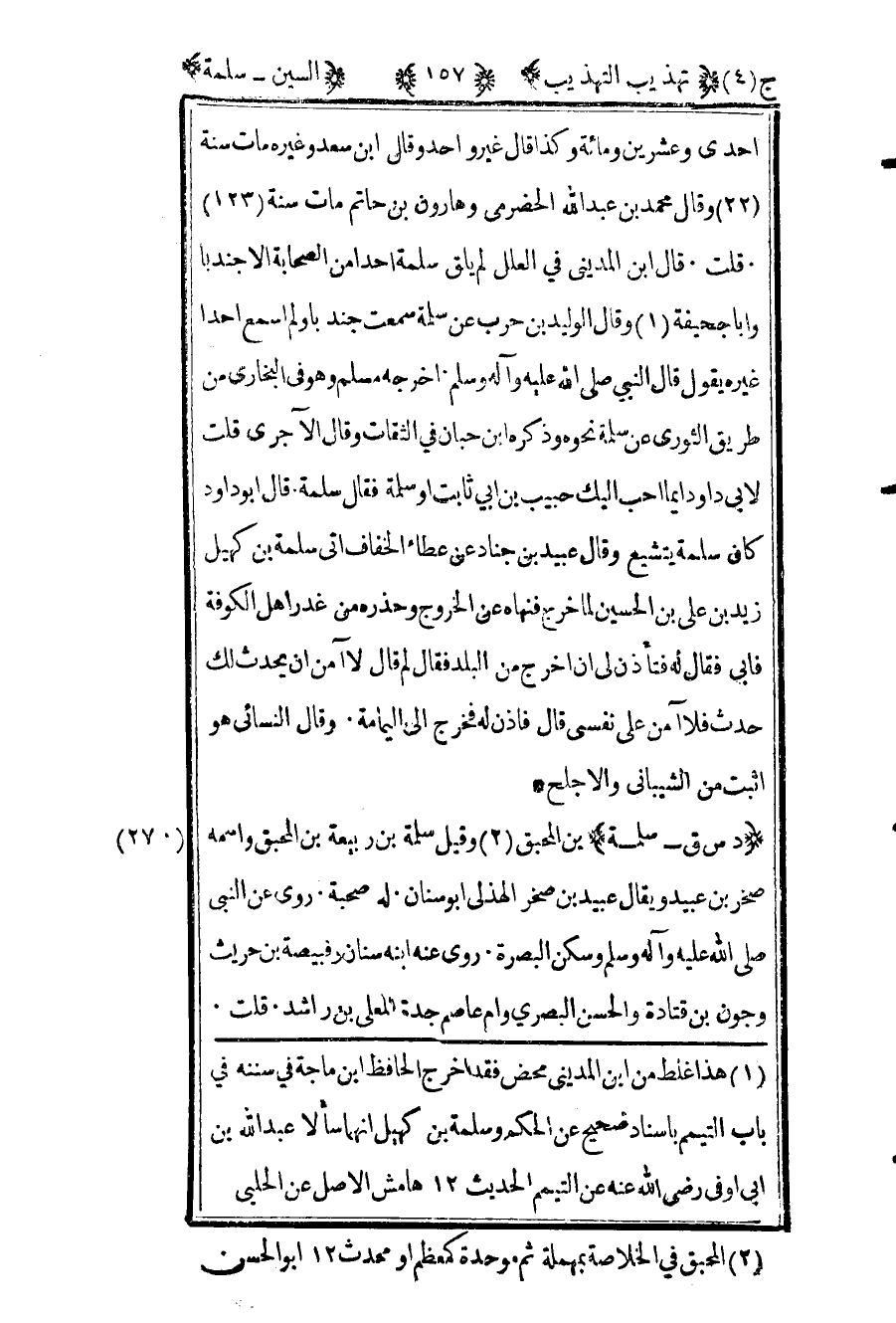 إحدى وعشرين ومائة وكذا قال غير واحد وقال ابن سعد وغيره مات سنة "22" وقال محمد بن عبد الله الحضرمي وهارون بن حاتم مات سنة "123" قلت قال ابن المديني في العلل لم يلق سلمة أحدا من الصحابة إلا جندبا وأبا جحيفة1 وقال الوليد بن حرب عن سلمة سمعت جندبا ولم أسمع أحدا غيره يقول قال النبي صلى الله عليه وآله وسلم أخرجه مسلم وهو في البخاري من طريق الثوري عن سلمة نحوه وذكره ابن حبان في الثقات وقال الآجري قلت لأبي داود أيما أحب إليك حبيب بن ثابت أو سلمة فقال سلمة قال أبو داود كان سلمة يتشيع وقال عبيد بن جناد عن عطاء الخفاف أتى سلمة بن كهيل زيد بن علي بن الحسين لما خرج فنهاه عن الخروج وحذره من غدر أهل الكوفة فأبى فقال له فتأذن لي أن أخرج من البلد فقال لم قال لا آمن أن يحدث لك حدث فلا آمن على نفسي قال فأذن له فخرج إلى اليمامة وقال النسائي هو أثبت من الشيباني والأجلح.