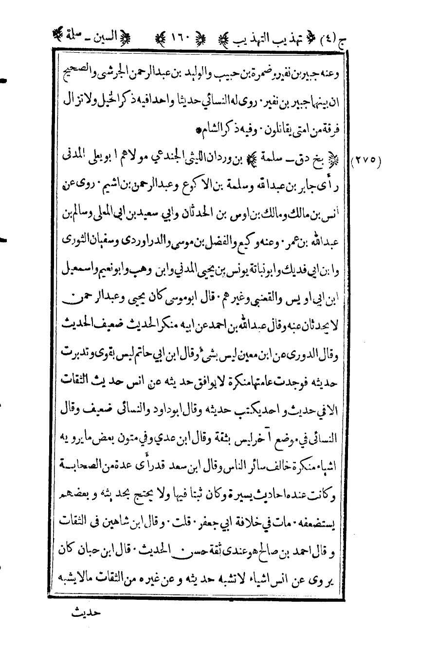275 "بخ د ق – سلمة" بن وردان الليثي الجندعي مولاهم أبو يعلى المدني رأى جابر بن عبد الله وسلمة بن الأكوع وعبد الرحمن بن أشيم روى عن أنس بن مالك ومالك بن أوس بن الحدثان وأبي سعيد بن أبي المعلى وسالم بن عبد الله بن عمر وعنه وكيع والفضل بن موسى والداروردي وسفيان الثوري وابن أبي فديك وأبو نباتة يونس بن يحيى المدني وابن وهب وأبو نعيم وإسماعيل بن أبي أويس والقعنبي وغيرهم قال أبو موسى كان يحيى وعبد الرحمن لا يحدثان عنه وقال عبد الله بن أحمد عن أبيه منكر الحديث ضعيف الحديث وقال الدوري عن ابن معين ليس بشيء وقال ابن أبي حاتم ليس بقوي وتدبرت حديثه فوجدت عامتها منكرة لا يوافق حديثه عن أنس حديث الثقات إلا في حديث واحد يكتب حديثه وقال أبو داود والنسائي ضعيف وقال النسائي في موضع آخر ليس بثقة وقال ابن عدي وفي متون بعض ما يرويه أشياء منكرة خالف سائر الناس وقال ابن سعد قد رأى عدة من الصحابة وكانت عنده أحاديث يسيرة وكان ثبتا فيها ولا يحتج بحديثه وبعضهم يستضعفه مات في خلافة أبي جعفر قلت وقال ابن شاهين في الثقات وقال أحمد بن صالح هو عندي ثقة حسن الحديث قال ابن حبان كان يروي عن أنس أشياء لا تشبه حديثه وعن غيره من الثقات ما لا يشبه