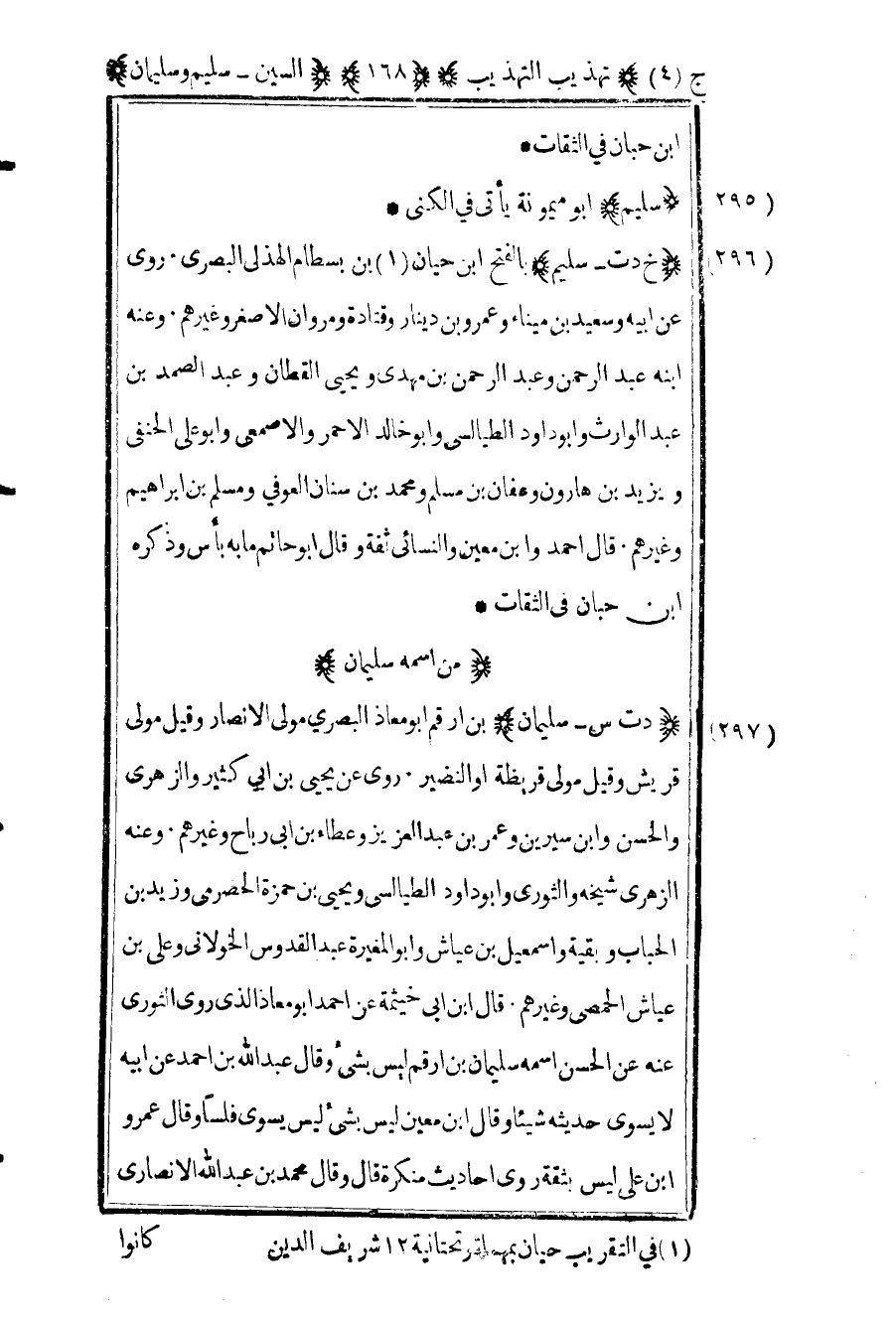 296- "خ د ت – سليم" بالفتح ابن حيان1 بن بسطام الهذلي البصري روى عن أبيه وسعيد بن ميناء وعمرو بن دينار وقتادة ومروان الأصغر وغيرهم وعنه ابنه عبد الرحمن وعبد الرحمن بن مهدي ويحيى القطان وعبد الصمد بن عبد الوارث وأبو داود الطيالسي وأبو خالد الأحمر والأصمعي وأبو علي الحنفي ويزيد بن هارون وعفان بن مسلم ومحمد بن سنان العوفي ومسلم بن إبراهيم وغيرهم قال أحمد وابن معين والنسائي ثقة وقال أبو حاتم ما به بأس وذكره ابن حبان في الثقات.