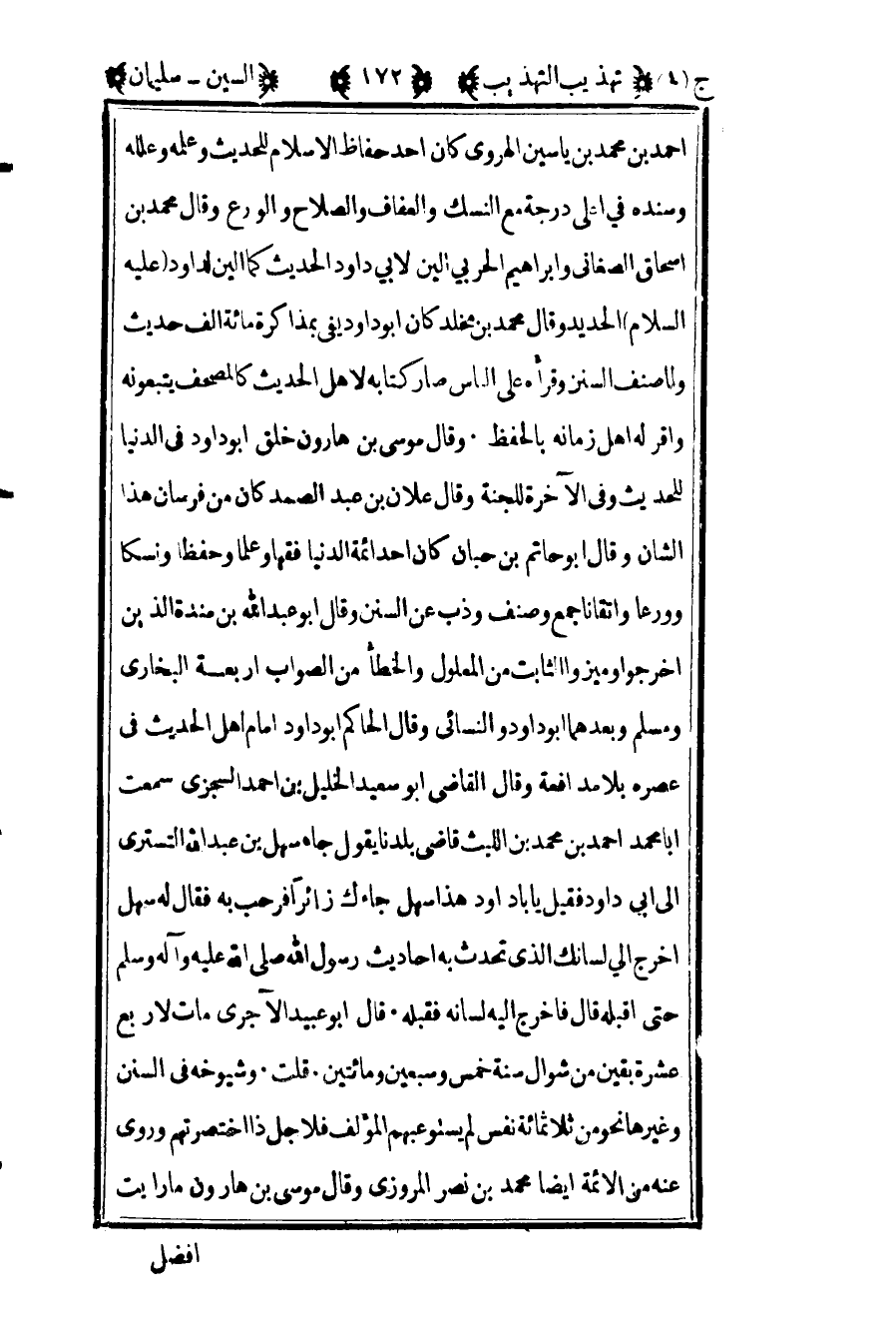 أحمد بن محمد بن ياسين الهروي كان أحد حفاظ الإسلام للحديث وعلمه وعلله وسنده في أعلى درجة مع النسك والعفاف والصلاح والورع وقال محمد بن إسحاق الصغاني وإبراهيم الحربي ألين لأبي داود الحديث كما ألين لداود عليه السلام الحديد وقال محمد بن مخلد كان أبو داود يفي بمذاكرة مائة ألف حدث ولما صنف السنن وقرأه على الناس صار كتابه لأهل الحديث كالمصحف يتبعونه وأقر له أهل زمانه بالحفظ وقال موسى بن هارون خلق أبو داود في الدنيا للحديث وفي الآخرة للجنة وقال علان بن عبد الصمد كان من فرسان هذا الشأن وقال أبو حاتم بن حبان كان أحد أئمة الدنيا فقها وعلما وحفظا ونسكا وورعا وإتقانا جمع وصنف وذب السنن وقال أبو عبد الله بن منده الذين اخرجوا وميزوا الثبات من المعلول والخطأ من الصواب أربعة البخاري ومسلم وبعدهما أبو داود والنسائي وقال الحاكم أبو داود إمام أهل الحديث في عصره بلا مدافعة وقال القاضي أبو سعيد الخليل بن أحمد السجزي سمعت أبا محمد أحمد بن محمد بن الليث قاضي بلدنا يقول جاء سهل بن عبد الله التستري إلى أبي داود فقيل يا أبا داود هذا سهل جاءك زائرا فرحب به فقال له سهل أخرج إلي لسانك الذي تحدث به أحاديث رسول الله صلى الله عليه وآله وسلم حتى أقبله فأخرج إليه لسانه فقبله قال أبو عبيد الآجري مات لأربع عشرة بقين من شوال سنة خمس وسبعين ومائتين قلت وشيوخه في السنن وغيرها نحو من ثلاثمائة نفس لم يستوعبهم المؤلف فلأجل ذا اختصرتهم وروى عنه من الأئمة أيضا محمد بن نصر المروزي وقال موسى بن هارون ما رأيت