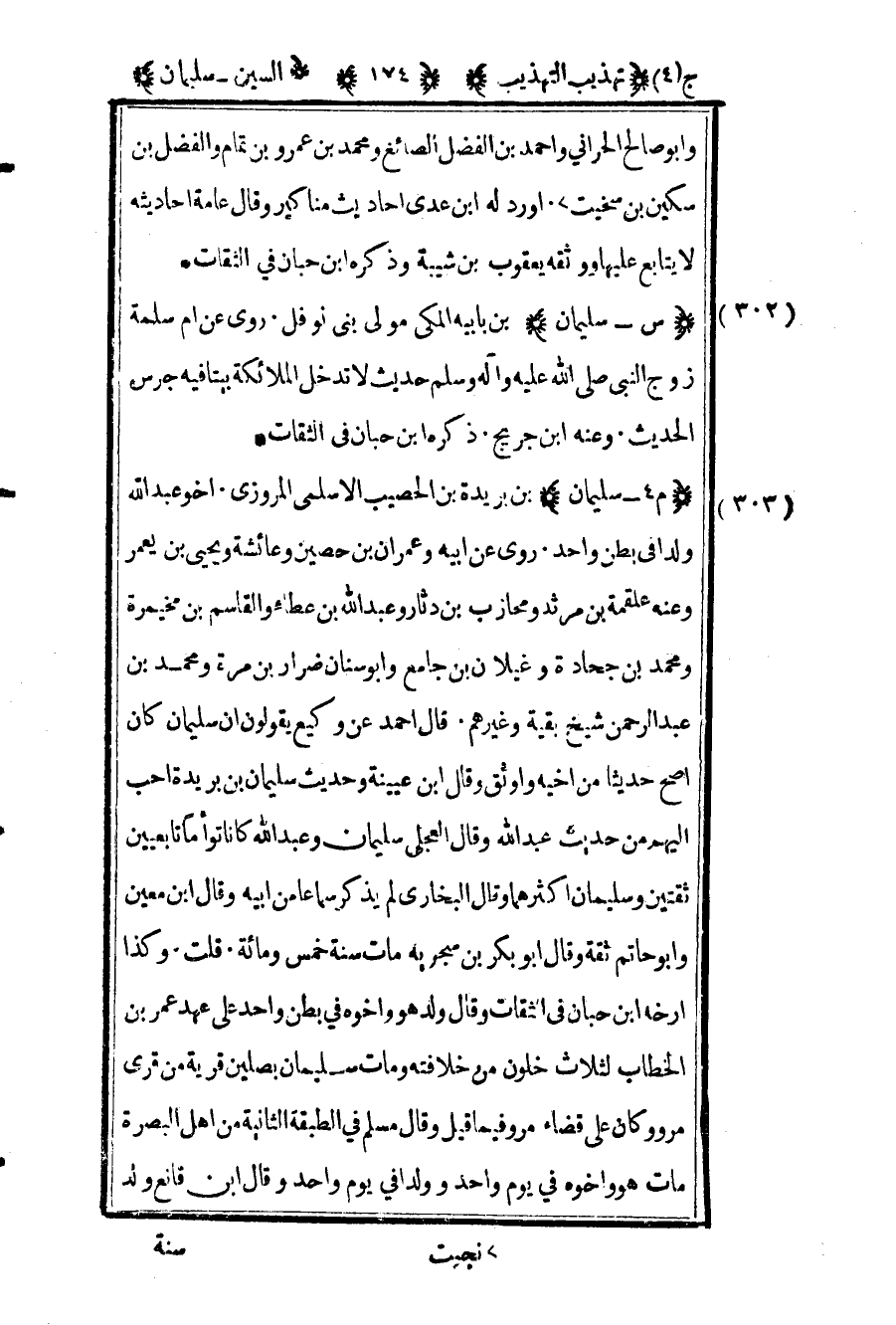 303 – "م 4 – سليمان" بن بريدة بن الحصيب الأسلمي المروزي أخو عبد الله ولدا في بطن واحد روى عن أبيه وعمران بن حصين وعائشة ويحيى بن يعمر وعنه علقمة بن مرثد ومحارب بن دثار وعبد الله بن عطاء والقاسم بن مخيمرة ومحمد بن جحادة وغيلان بن جامع وأبو سنان ضرار بن مرة ومحمد بن عبد الرحمن شيخ بقية وغيرهم قال أحمد عن وكيع يقولون أن سليمان كان أصح حديثا من أخيه وأوثق وقال ابن عيينة وحديث سليمان بن بريدة أحب إليهم من حديث عبد الله وقال العجلي سليمان وعبد الله كانا توأما تابعيين ثقتين وسليمان أكثرهما وقال البخاري لم يذكر سماعا بن أبيه وقال ابن معين وأبو حاتم ثقة وقال أبو بكر بن سجريه مات سنة خمس ومائة قلت وكذا أرخه بن حبان في الثقات وقال ولد هو وأخوه في بطن واحد على عهد عمر بن الخطاب لثلاث خلون من خلافته ومات سليمان بصلين قرية من قرى مرو وكان على قضاء مرو فيما قيل وقال مسلم في الطبقة الثانية من أهل البصرة مات هو وأخوه في يوم واحد وولدا في يوم واحد وقال ابن قانع ولد