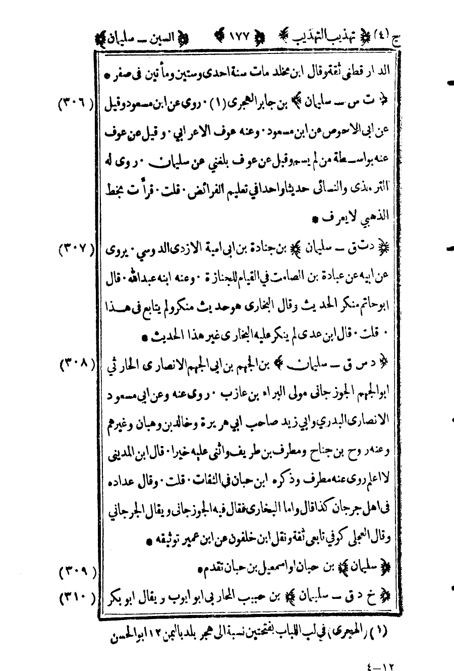 306- "ت س – سليمان" بن جابر الهجري1 روى عن ابن مسعود وقيل عن أبي الأحوص عن ابن مسعود وعنه عوف الأعرابي وقيل عن عوف عنه بواسطة من لم يسم وقيل عن عوف بلغني عن سليمان روى له الترمذي والنسائي حديثا واحدا في تعليم الفرائض قلت قرأت بخط الذهبي لا يعرف.