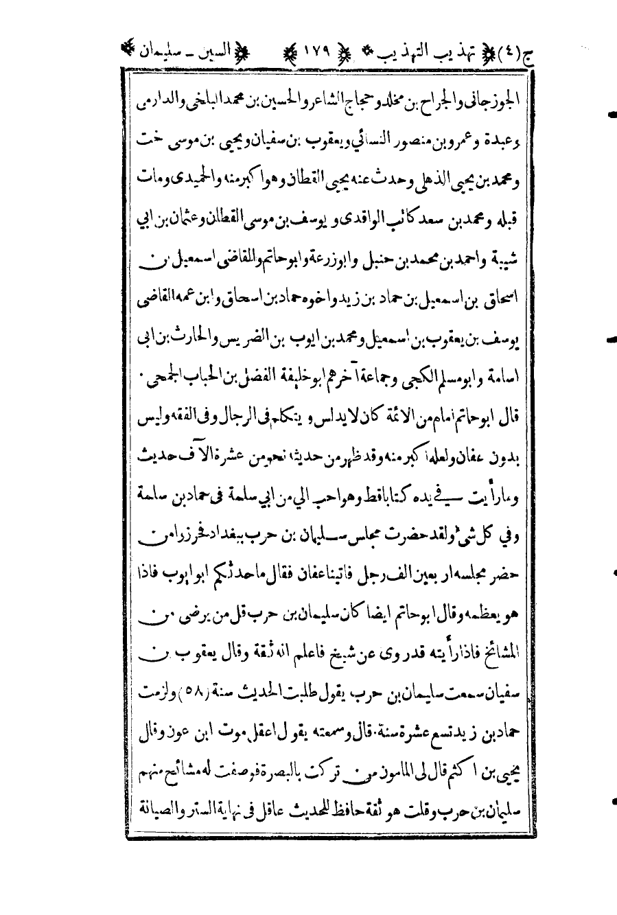 الجوزجاني والجراح بن مخلد وحجاج الشاعر والحسين بن محمد البلخي والدارمي وعبدة وعمرو بن منصور النسائي ويعقوب بن سفيان ويحيى بن موسى خت ومحمد بن يحيى الذهلي وحدث عنه يحيى القطان وهو أكبر منه والحميدي ومات قبله ومحمد بن سعد كاتب الواقدي ويوسف بن موسى القطان وعثمان بن أبي شيبة وأحمد بن محمد بن حنبل وأبو زرعة وأبو حاتم والقاضي وإسماعيل بن إسحاق بن إسماعيل بن حماد بن زيد وأخوه حماد بن إسحاق وابن عمه القاضي يوسف بن يعقوب بن إسماعيل ومحمد بن أيوب بن الضريس والحارث بن أبي أسامة وأبو مسلم الكجي وجماعة آخرهم أبو خليفة الفضل بن الحباب الجمحي قال أبو حاتم إمام من الأئمة كان لا يدلس ويتكلم في الرجال وفي الفقه وليس بدون عفان ولعله أكبر منه وقد ظهر من حديثه نحو من عشرة آلاف حديث وما رأيت في يده كتابا قط وهو أحب إلي من أبي سلمة في حماد بن سلمة وفي كل شيء ولقد حضرت مجلس سليمان بن حرب ببغداد فحرزوا من حضر مجلسه أربعين ألف رجل فأتينا عفان فقال ما حدثكم أبو أيوب فإذا هو يعظمه وقال أبو حاتم أيضا كان سليمان بن حرب قل من يرضى من المشائخ فإذا رأيته قد روى عن شيخ فاعلم أنه ثقة وقال يعقوب بن سفيان سمعت سليمان بن حرب يقول طلبت الحديث سنة "58" ولزمت حماد بن زيد تسع عشرة سنة قال وسمعته يقول أعقل موت بن عون وقال يحيى بن أكثم قال لي المأمون من تركت بالبصرة فوصفت له مشائخ منهم سليمان بن حرب وقلت هو ثقة حافظ للحديث عاقل في نهاية الستر والصيانة