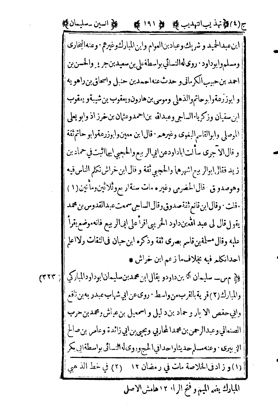 323- "م س – سليمان" بن داود ويقال ابن محمد بن سليمان أبو داود المباركي والمبارك2 قرية بالقرب من واسط روى عن أبي شهاب عبد ربه بن نافع وأبي حفص الأبار وحماد بن دليل وإسماعيل بن عياش ومحمد بن حرب الصنعاني وعبد الرحمن بن محمد المحاربي ويحيى بن أبي زائدة وعامر بن صالح الزبيري وعنه مسلم حديثا واحدا في الحج وروى له النسائي بواسطة أبي بكر