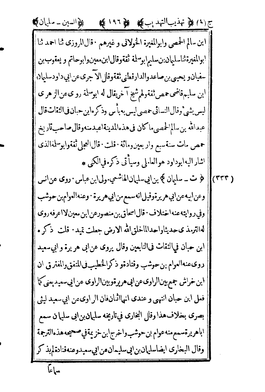 333- "ت – سليمان" بن أبي سليمان الهاشمي مولى بن عباس روى عن أنس وعن أبيه عن أبي هريرة وقيل أنه سمع من أبي هريرة وعنه العوام بن حوشب وفي روايته عنه اختلاف قال إسحاق بن منصور عن ابن معين لا أعرفه روى له الترمذي حديثا واحدا لما خلق الله أرض جعلت تميد قلت ذكره ابن حبان في الثقات في التابعين وقال يروي عن أبي هريرة وأبي سعيد روى عنه العوام بن حوشب وقتادة وذكر الخطيب في المتفق والمفترق أن بن خراش جمع بين الرواي عن أبي هريرة وبين الراوي عن أبي سعيد يعني كما فعل بن حبان انتهى وعندي إنهما اثنان فإن الراوي عن أبي سعيد ليثي بصري بخلاف هذا وقال البخاري في تاريخه سليمان بن سليمان سمع أبا هريرة سمع منه عوام بن حوشب وأخرج بن خزيمة في صحيحة هذه الترجمة وقال البخاري أيضا سليمان بن أبي سليمان عن أبي سعيد وعنه قتادة لم يذكر