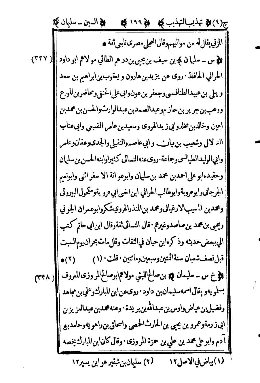 337- "س – سليمان" بن سيف بن يحيى بن درهم الطائي مولاهم أبو داود الحراني الحافظ روى عن يزيد بن هارون ويعقوب بن إبراهيم بن سعد ويعلى بن عبيد الطنافسي وجعفر بن عون وأبي علي الحنفي ومحاضر بن المورع ووهب بن جرير بن حازم وعبد الصمد بن عبد الوارث والحسن بن محمد بن أعين وخالد بن مخلد وأبي زيد الهروي وسعيد بن عامر الضبعي وأبي عتاب الدلال وشعيب بن بيان وأبي عاصم والنفيلي والجدي وعفان وعامر وأبي الوليد الطيالسي وجماعة روى عنه النسائي كثيرا وابنه الحسن بن سليمان وحفيده أبو علي أحمد بن محمد بن سليمان وأبو عوانة الإسفرائيني وأبو نعيم الجرجاني وأبو عروبة وأبو طالب الحراني بن أخي أبي عروبة ومكحول البيروتي ومحمد بن المسيب الأرغياني ومحمد بن المنذر الهروي شكر وأبو عمران الجوني ويحيى بن محمد بن صاصد وغيرهم قال النسائي ثقة وقال ابن أبي حاتم كتب إلي ببعض حديثه وذكره ابن حبان في الثقات وقال مات بحران يوم السبت قيل نصف شعبان اثنتين وسبعين ومائتين قلت.1