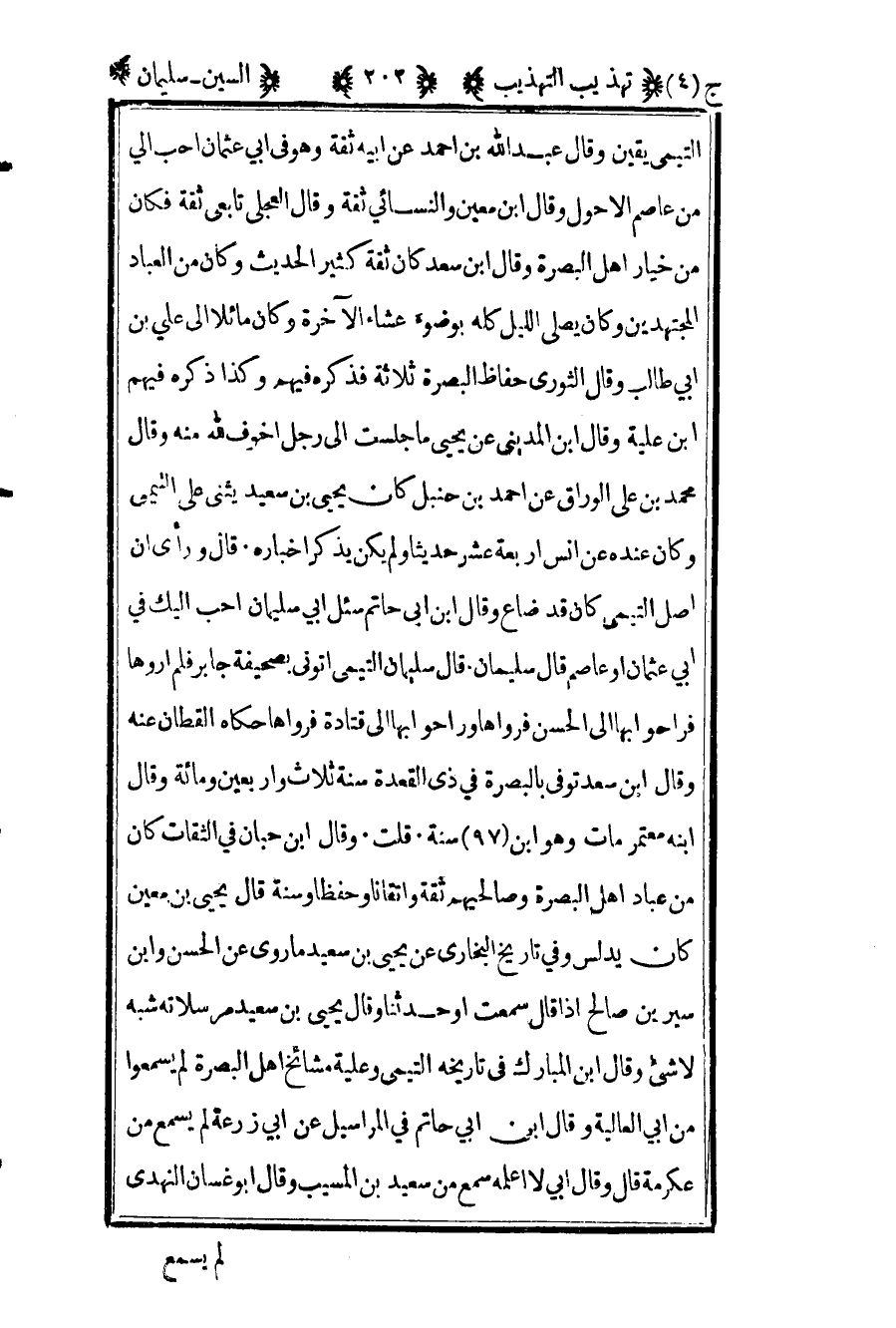 التيمي يقين وقال عبد الله بن أحمد عن أبيه ثقة وهو في عثمان أحب إلي من عاصم الأحول وقال ابن معين والنسائي ثقة وقال العجلي تابعي ثقة فكان من خيار أهل البصرة وقال ابن سعد كان ثقة كثير الحديث وكان من العباد المجتهدين وكان يصلي الليل كله بوضوء عشاء الآخرة وكان مائلا إلى علي بن أبي طالب وقال الثوري حفاظ البصرة ثلاثة فذكره فيهم وكذا ذكره فيهم بن علية وقال ابن المديني عن يحيى ما جلست إلى رجل أخوف لله منه وقال محمد بن علي الوراق عن أحمد بن حنبل كان يحيى بن سعيد يثني على التيمي وكان عنده عن أنس أربعة عشر حديثا ولم يكن يذكر اخباره قال ورأى أن أصل التيمي كان قد ضاع وقال ابن أبي حاتم سئل أبي سليمان أحب إليك في أبي عثمان أو عاصم قال سليمان قال سليمان التيمي أتوني بصحيفة جابر فلم اروها فراحوا بها إلى الحسن فرواها وراحوا بها إلى قتادة فرواها حكاه القطان عنه وقال ابن سعد توفي بالبصرة في ذي القعدة سنة ثلاث وأربعين ومائة وقال ابنه معتمر مات وهو ابن "97" سنة قلت وقال ابن حبان في الثقات كان من عباد أهل البصرة وصالحيهم ثقة وإتقانا وحفظا وسنة قال يحيى بن معين كان يدلس وفي تاريخ البخاري عن يحيى بن سعيد ما روى عن الحسن وابن سيرين صالح إذا قال سمعت أو حدثنا وقال يحيى بن سعيد مرسلاته شبة لا شيء وقال ابن المبارك في تاريخه التيمي وعلية مشائخ أهل البصرة لم يسمعوا من أبي العالية وقال ابن أبي حاتم في المراسيل عن أبي زرعة لم يسمع عن عكرمة قال وقال أبي لا أعلمه سمع من سعيد بن المسيب وقال أبو غسان النهدي