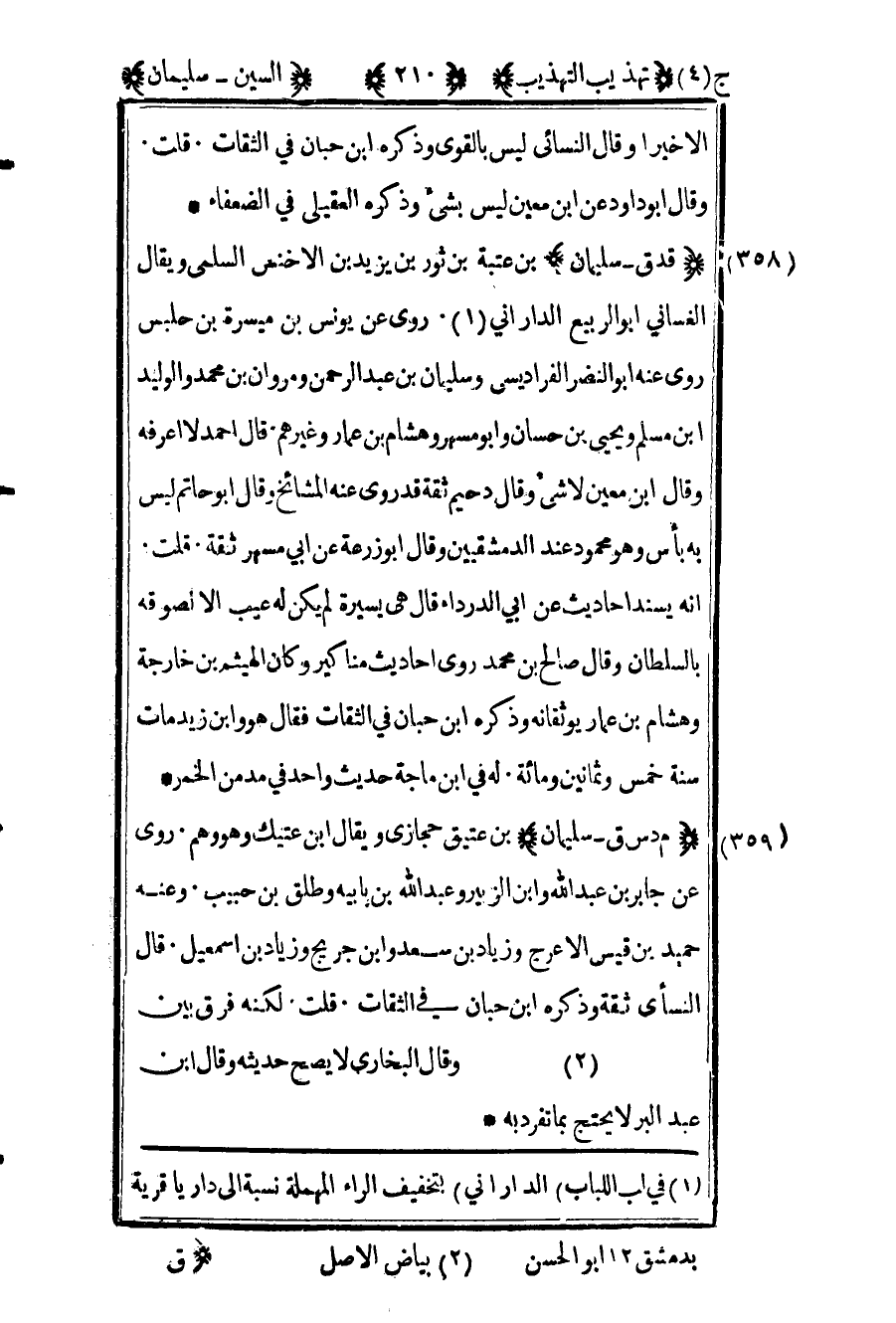 358- "قد ق – سليمان" بن عتبة بن ثور بن يزيد بن الأخنس السلمي ويقال الغساني أبو الربيع الداراني1 روى عن يونس بن ميسرة بن حلبس روى عنه أبو النضر الفراديسي وسليمان بن عبد الرحمن ومروان بن محمد والوليد بن مسلم ويحيى بن حسان وأبو مسهر وهشام بن عمار وغيرهم قال أحمد لا أعرفه وقال ابن معين لا شيء وقال دحيم ثقة وقد روى عنه المشائخ وقال أبو حاتم ليس به بأس وهو محمود عند الدمشقيين وقال أبو زرعة عن أبي مسهر ثقة قلت أنه يسند أحاديث عن أبي الدرداء قال هي يسيرة لم يكن له عيب إلا لصوقه بالسلطان وقال صالح بن محمد روى أحاديث مناكير وكان الهيثم بن خارجة وهشام بن عمار يوثقانه وذكره ابن حبان في الثقات فقال هو وابن زيد مات سنة خمس وثمانين ومائة له في ابن ماجة حديث واحد في مدمن الخمر.