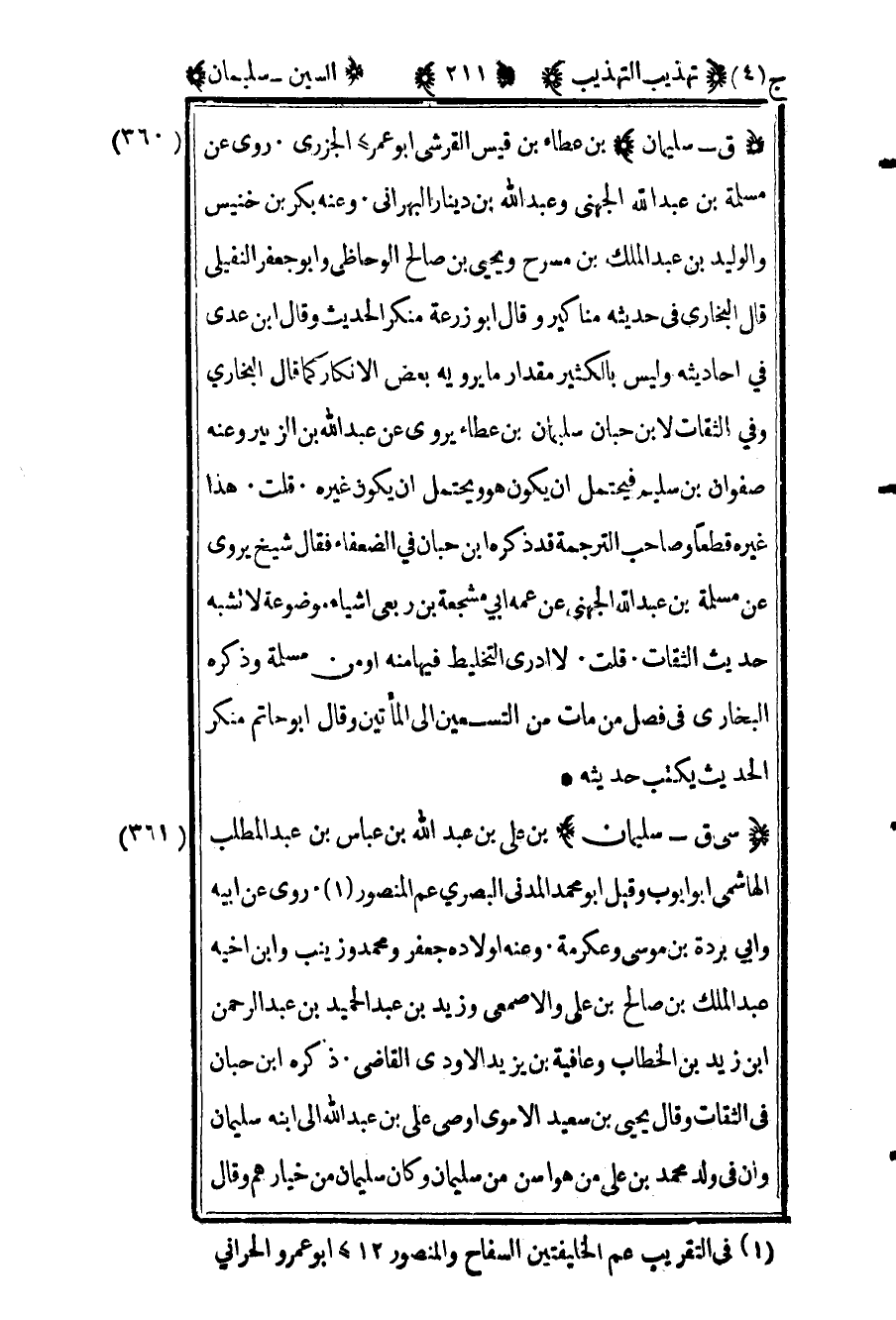 361- "س ق – سليمان" بن علي بن عبد الله بن عباس بن عبد المطلب الهاشمي أبو أيوب وقيل أبو أيوب وقيل أبو محمد المدني البصري عم المنصور1 روى عن أبيه وأبي بردة بن موسى وعكرمة وعنه أولاده جعفر ومحمد وزينب بن أخيه عبد الملك بن صالح بن علي والأصمعي وزيد بن عبد الحميد بن عبد الرحمن بن زيد بن الخطاب وعافية بن يزيد الأودي القاضي ذكره ابن حبان في الثقات وقال يحيى بن سعيد الأموي أوصى علي بن عبد الله إلى ابنه سليمان وأن في ولد محمد بن علي من هو أسن من سليمان وكان سليمان من خيارهم وقال