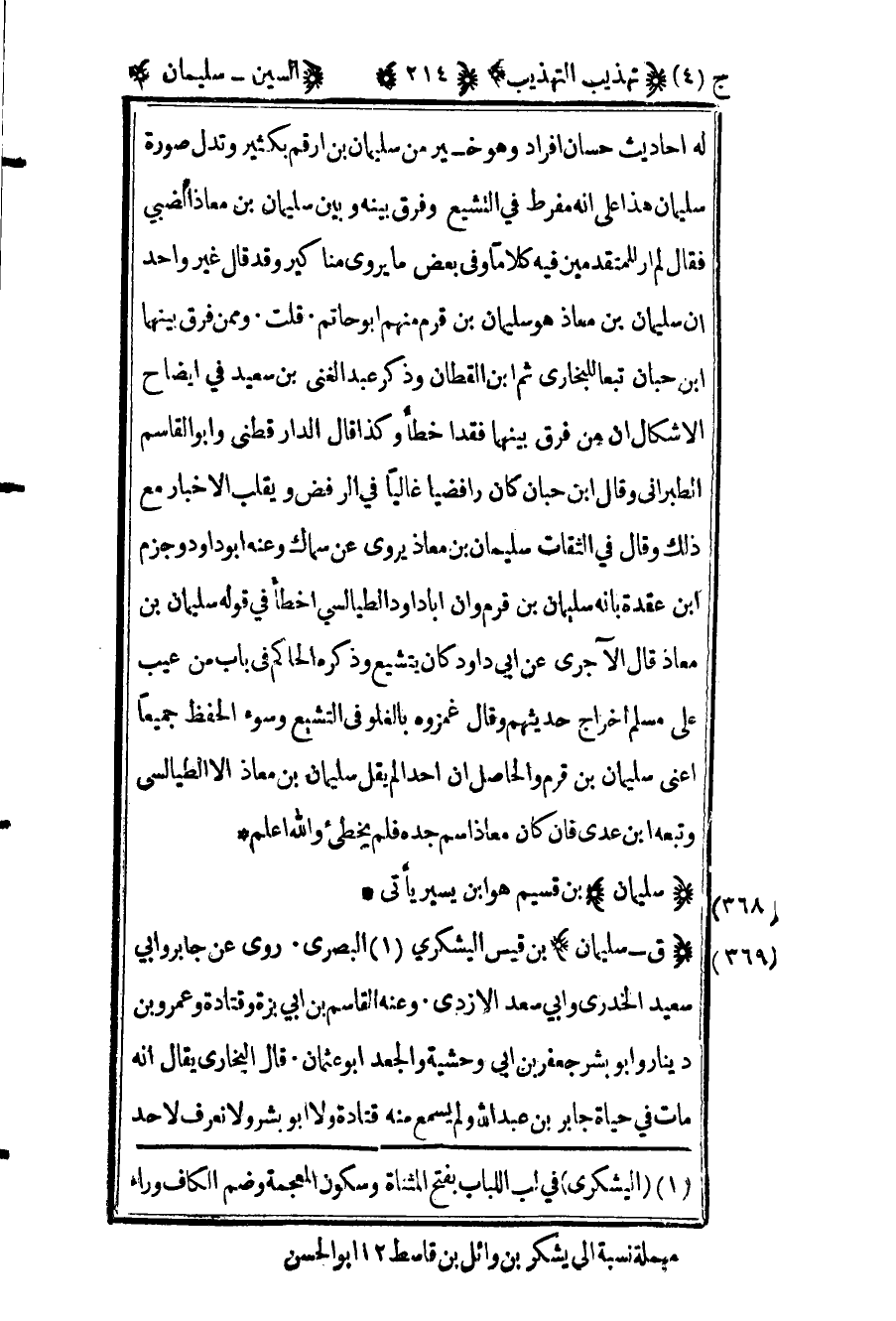 368- "ق – سليمان" بن قيس اليشكري1 البصري روى عن جابر وأبي سعيد الخدري وأبي سعد الأزدي وعنه القاسم بن أبي هريرة بن أبي بزة وقتادة وعمرو بن دينار وأبو بشر جعفر بن أبي وحشية والجعد أبو عثمان قال البخاري يقال أنه مات في حياة جابر بن عبد الله ولم يسمع منه قتادة ولا أبو بشر ولا نعرف لأحد